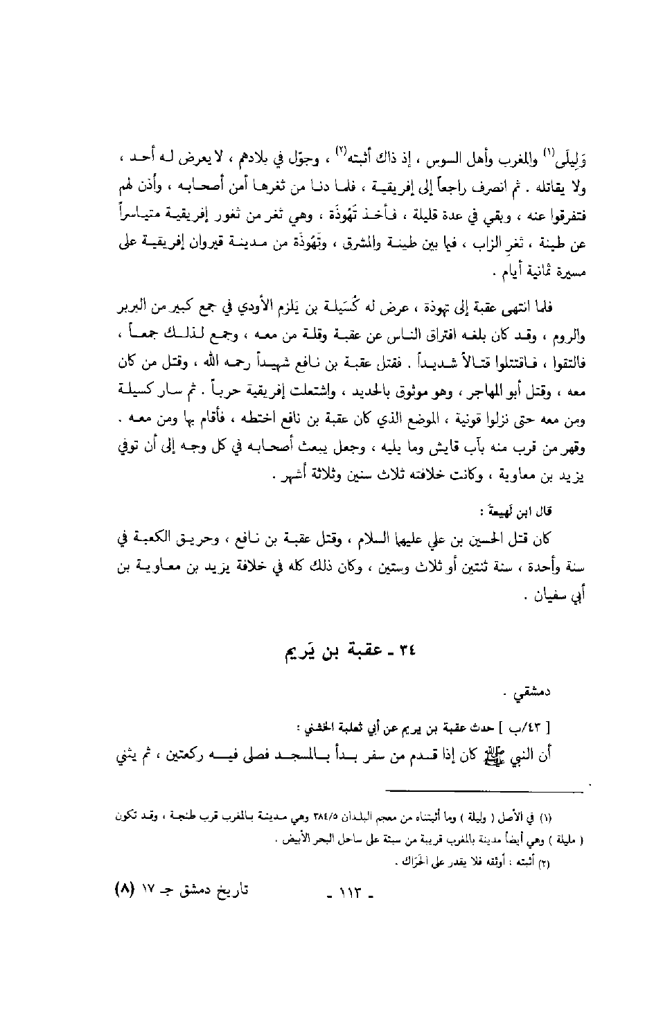 فلما انتهى عقبة إلى تهوذة، عرض له كسيلة بن يلزم الأودي في جمع كبير من البربر والروم، وقد كان بلغه افتراق الناس عن عقبة وقلة من معه، وجمع لذلك جمعاً، فالتقوا، فاقتتلوا قتالاً شديداً. فقتل عقبة بن نافع شهيداً رحمه الله، وقتل من كان معه، وقتل أبو المهاجر، وهو موثوق بالحديد، واشتعلت إفريقية حرباً. ثم سار كسيلة ومن معه حتى نزلوا قونية، الموضع الذي كان عقبة بن نافع اختطه، فأقام بها ومن معه. وقهر من قرب منه بآب قايش وما يليه، وجعل يبعث أصحابه في كل وجه إلى أن توفي يزيد بن معاوية، وكانت خلافته ثلاث سنين وثلاثة أشهر.