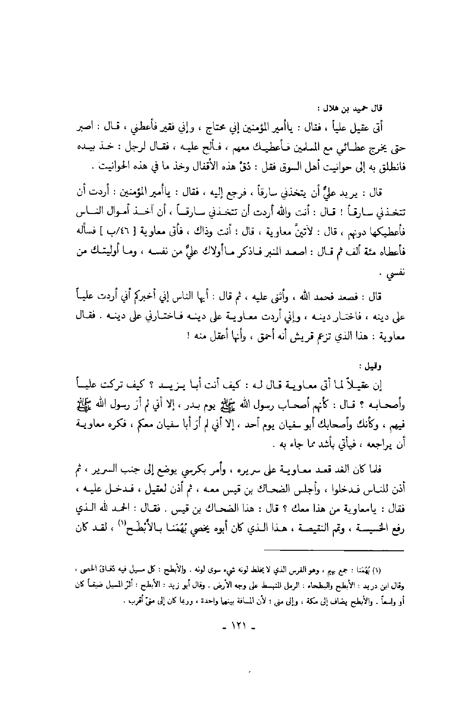 قال: يريد عليٌّ أن يتخذني سارقاً، فرجع إليه، فقال: يا أمير المؤمنين: أردت أن تتخذني سارقاً! قال: أنت والله أردت أن تتخذني سارقاً، أن آخذ أموال الناس فأعطيكها دونهم، قال: لآتينّ معاوية، قال؛ أنت وذاك، فأتى معاوية فسأله فأعطاه مئة ألف ثم قال: اصعد المنبر فاذكر ما أولاك عليٌّ من نفسه، وما أوليتك من نفسي.