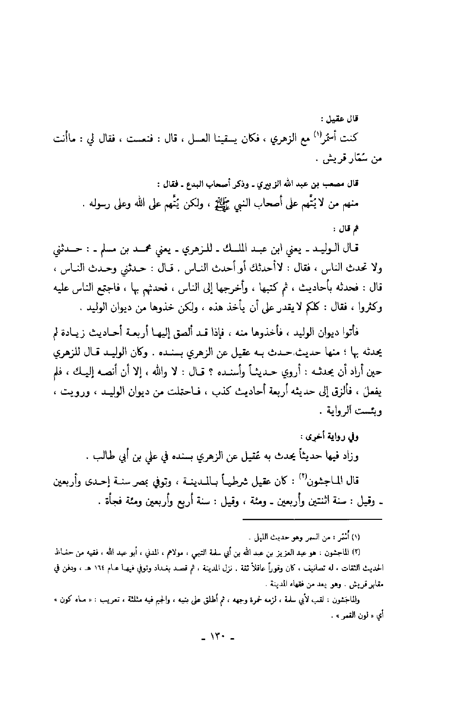 فأتوا ديوان الوليد، فأخذوها منه، فإذا قد ألصق إليها أربعة أحاديث زيادة لم يحدثه بها: منها حديث حدث به عقيل عن الزهري بسنده. وكان الوليد قال للزهري حين أراد أن يحدثه: أروي حديثاً وأسنده؟ قال: لا والله، إلا أن أنصه إليك، فلم يفعل، فألزق إلى حديثه أربعة أحاديث كذب، فاحتملت من ديوان الوليد، ورويت، وبئست الرواية.