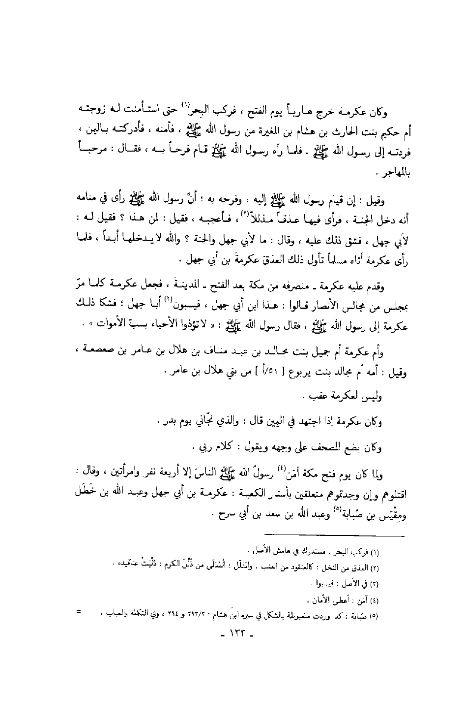 وكان عكرمة خرج هارباً يوم الفتح، فركب البحر حتى استأمنت له زوجته أم حكيم بنت الحراث بن هشام بن المغيرة من رسول الله صلّى الله عليه وسلّم، فأمنه، فأدركته باليمن، فردته إلى رسول الله صلّى الله عليه وسلّم. فلما رآه رسول الله صلّى الله عليه وسلّم قام فرحاً به، فقال: " مرحباً بالمهاجر ".
