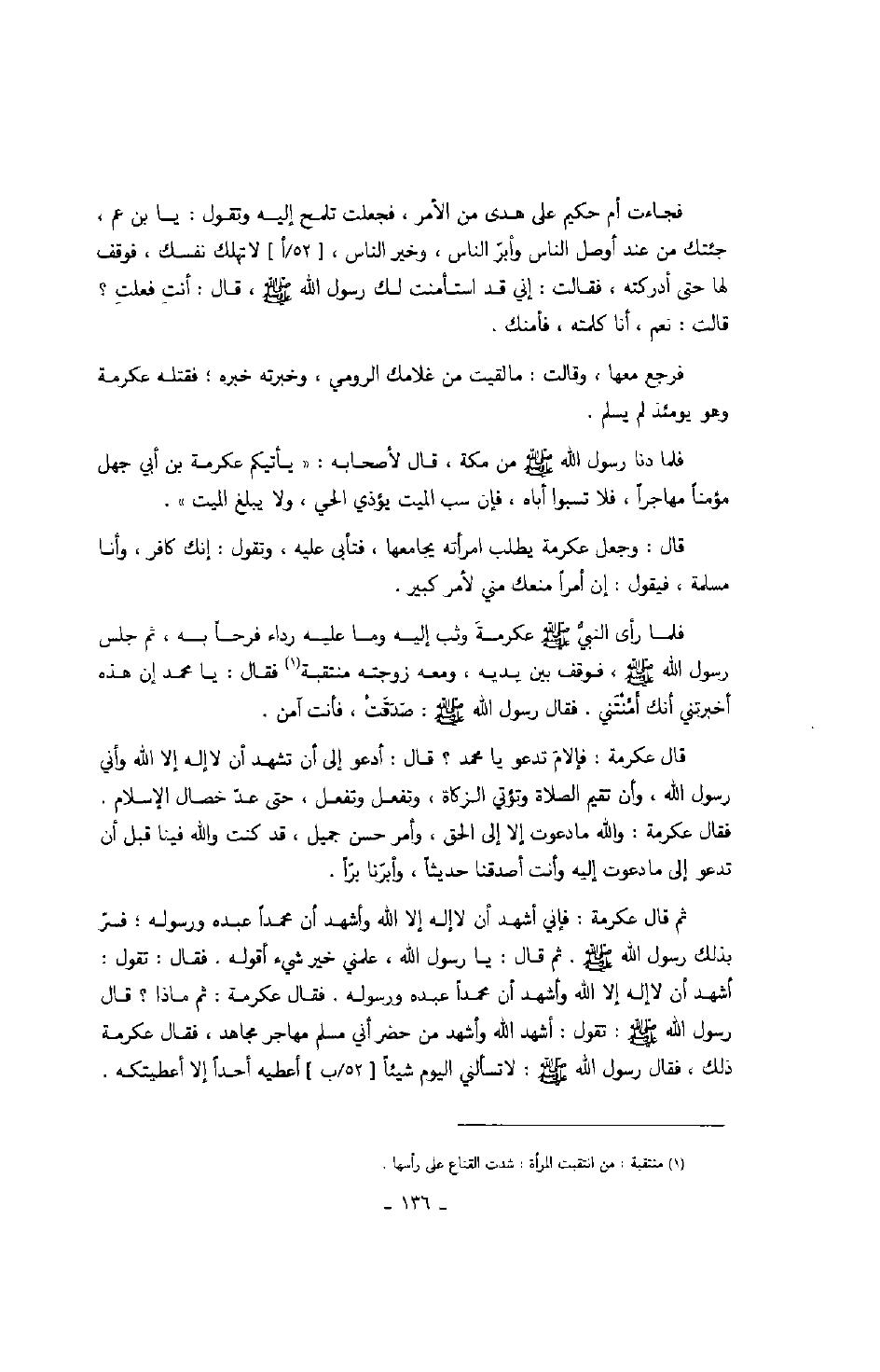 فجاءت أم حكيم على هدى من الأمر، فجعلت تلمح إليه وتقول: يا بن عم، جئتك من عند أوصل الناس وأبرّ الناس، وخير الناس، لا تهلك نفسك، فوقف لها حتى أدركته، فقالت: إني قد استأمنت لك رسول الله صلّى الله عليه وسلّم، قال: أنت فعلت؟ قالت: نعم، أنا كلمته، فأمنك.