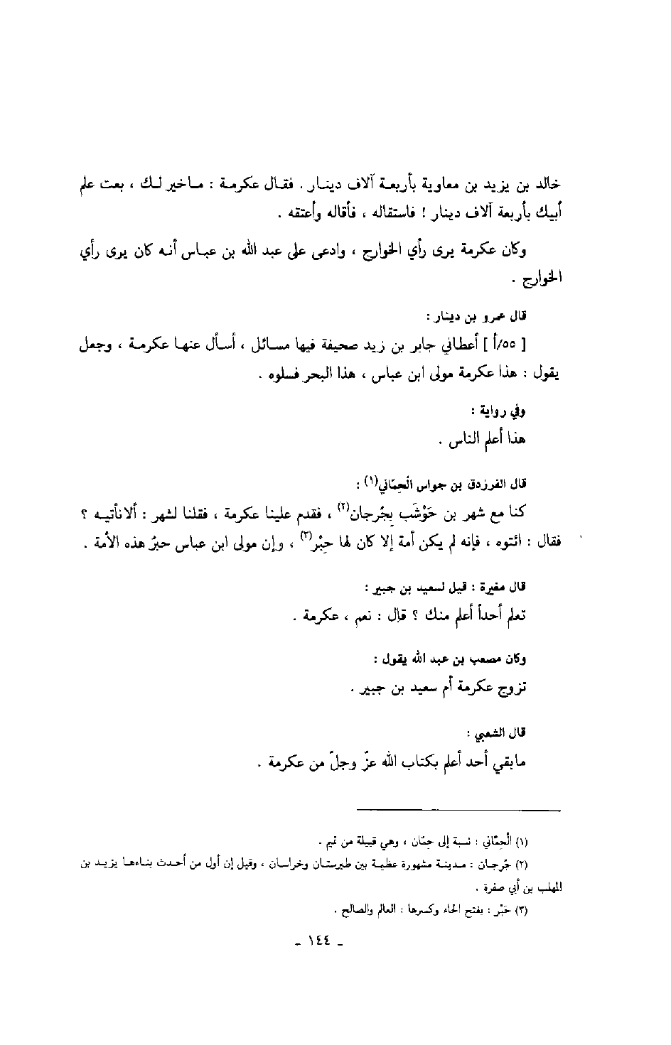 قال عمرو بن دينار: أعطاني جابر بن زيد صحيفة فيها مسائل، أسأل عنها عكرمة، وجعل يقول: هذا عكرمة مولى ابن عباس، هذا البحر فسلوه.