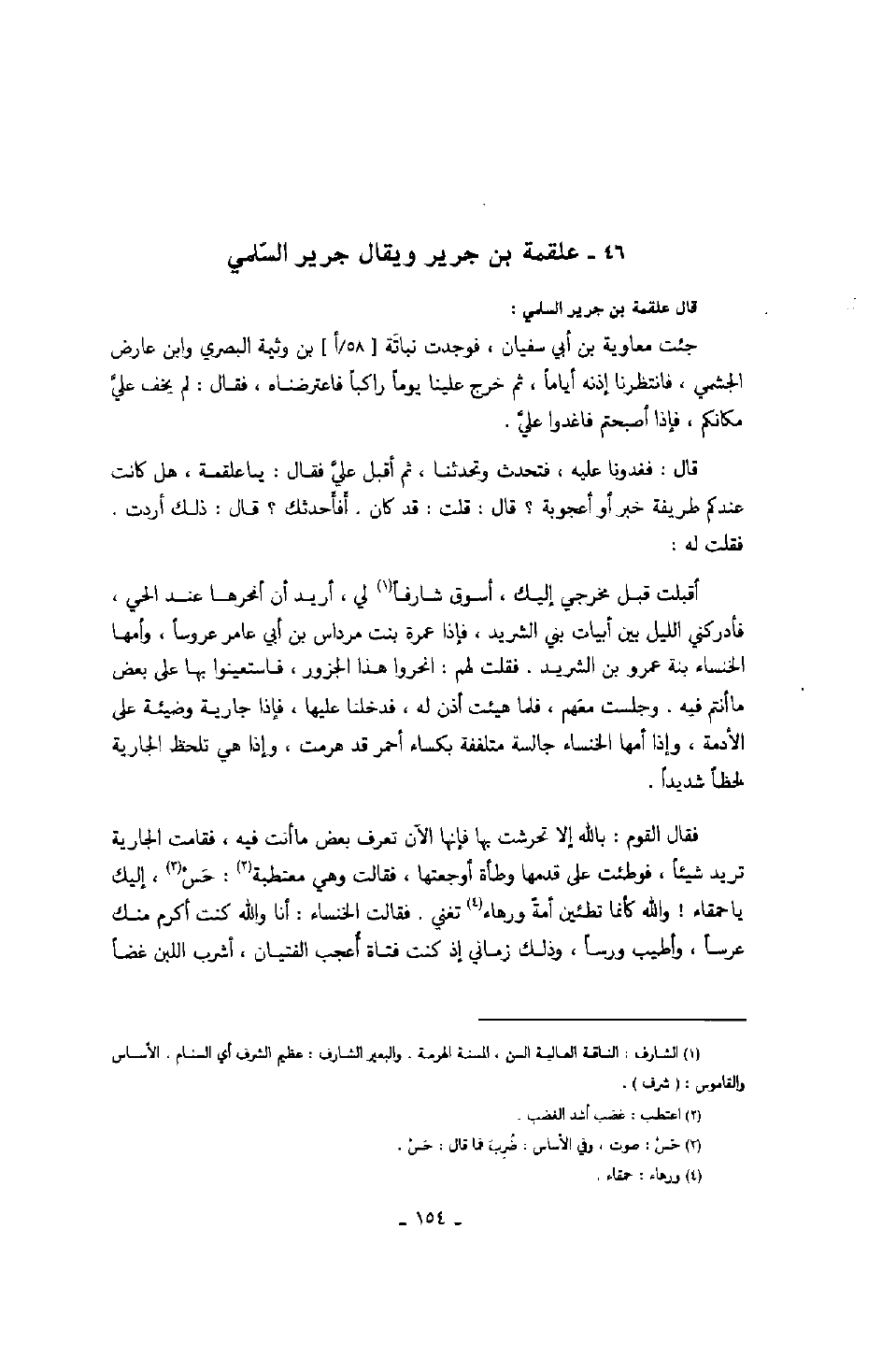 قال: فغدونا عليه، فتحدث وتحدثنا، ثم أقبل عليّ فقال: يا علقمة، هل كانت عندكم طريفة خبر أو أعجوبة؟ قال: قلت: قد كان. أفأحدثك؟ قال: ذلك أردت. فقلت له: أقبلت قبل مخرجي إليك، أسوق شارفاً لي، أريد أن أنحرها عند الحي، فأدركني الليل بين أبيات بني الشريد، فإذا عمرة بنت مرداس بن أبي عامر عروساً، وأمها الخنساء بنة عمرو بن الشريد. فقلت لهم: انحروا هذا الجزور، فاستعينوا بها على بعض ما أنتم فيه. وجلست معهم، فلما هيئت أذن له، فدخلنا عليها، فإذا جارية وضيئة على الأدمة، وإذا أمها الخنساء جالسة متلففة بكساء أحمر قد هرمت، وإذا هي تلحظ الجارية لحظاً شديداً.