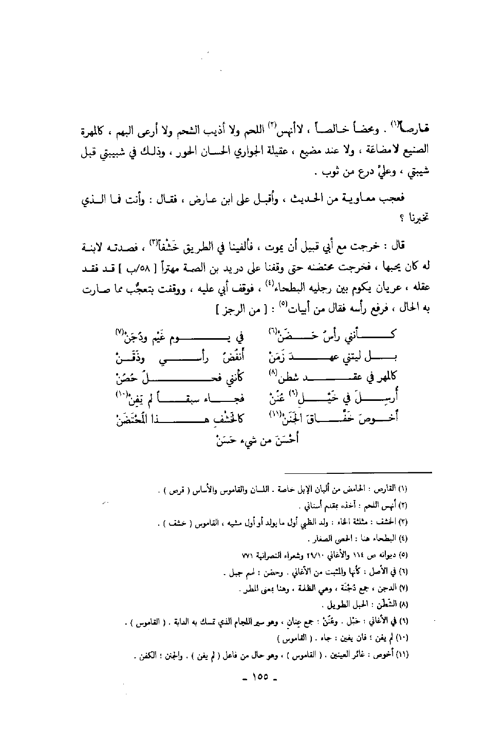 قارصاً. ومحضاً خالصاً، لا أنهس اللحم ولا أذيب الشحم ولا أرعى البهم، كالمهرة الصنيع لا مضاعة، ولا عند مضيع، عقيلة الجواري الحسان الحور، وذلك في شبيبتي قبل شيبتي، وعليّ درع من ثوب.