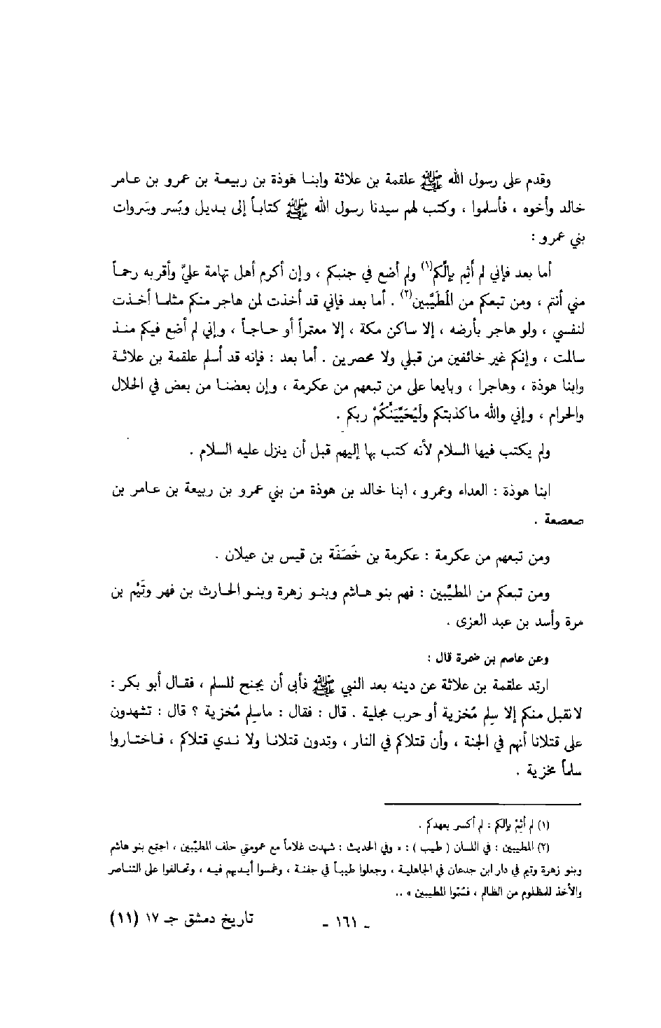 وقدم على رسول الله صلّى الله عليه وسلّم علقمة بن علاثة وابنا هوذة بن ربيعة بن عمرو بن عامر خالد وأخوه، فأسلموا، وكتب لهم سيدنا رسول الله صلّى الله عليه وسلّم كتاباً إل بديل وبسر وسروات بني عمرو: " أما بعد فإني لم أثم بإلّكم ولم أضع في جنبكم، وإن أكرم أهل تهامة عليّ وأقربه رحماً مني أنتم، ومن تبعكم من المطيّبين. أما بعد فإني قد أخذت لمن هاجر منكم مثلما أخذت لنفسي، ولو هاجر بأرضه، إلا ساكن مكة، إلا معتمراً أو حاجاً، وإني لم أضع فيكم منذ سالمت، وإنكم غير خائفين من قبلي ولا محصرين. أما بعد: فإنه قد أسلم علقمة بن علاثة وابنا هوذة، وهاجرا، وبايعا على من تبعهم من عكرمة، وإن بعضنا من بعض في الحلال والحرام، وإني والله ما كذتبكم وليحيّينّكم ربكم ".