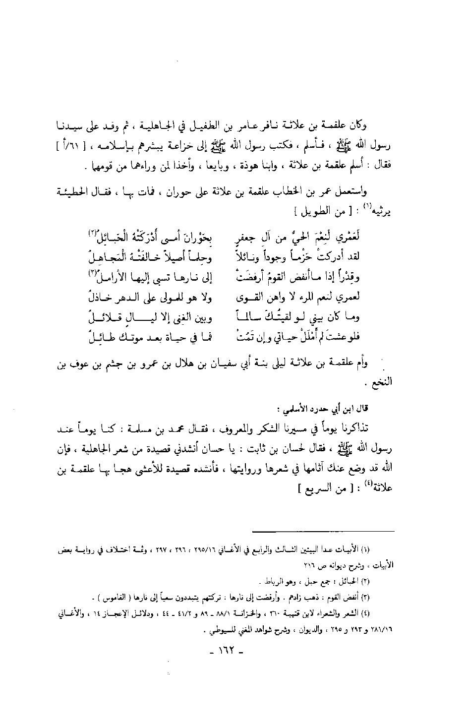 قال ابن أبي حدرد الأسلمي: تذاكرنا يوماً في مسيرنا الشكر والمعروف، فقال محمد بن مسلمة: كنا يوماً عند رسول الله صلّى الله عليه وسلّم، فقال لحسان بن ثابت: " يا حسان أنشدني قصيدة من شعر الجاهلية، فإن الله قد وضع عنك آثامها في شعرها وروايتها "، فأنشد قصيدة للأعشى هجا بها علقمة بن علاثة: من السريع