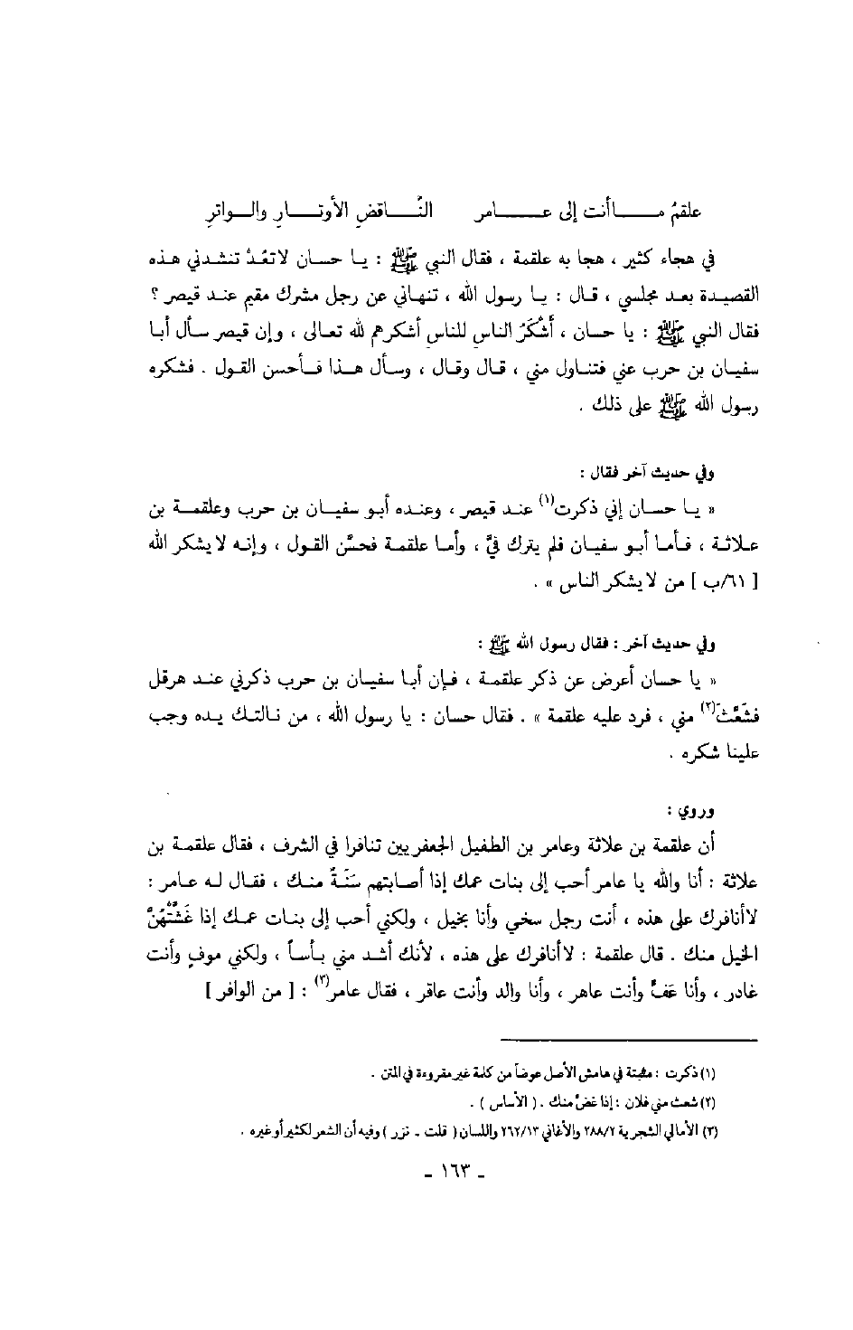 " يا حسان أعرض عن ذكر علقمة، فإن أبا سفيان بن حرب ذكرني عند هرق فشعّث مني، فرد عليه علقمة ". فقال حسان: يا رسول الله، من نالتك يده وجب علينا شكره.