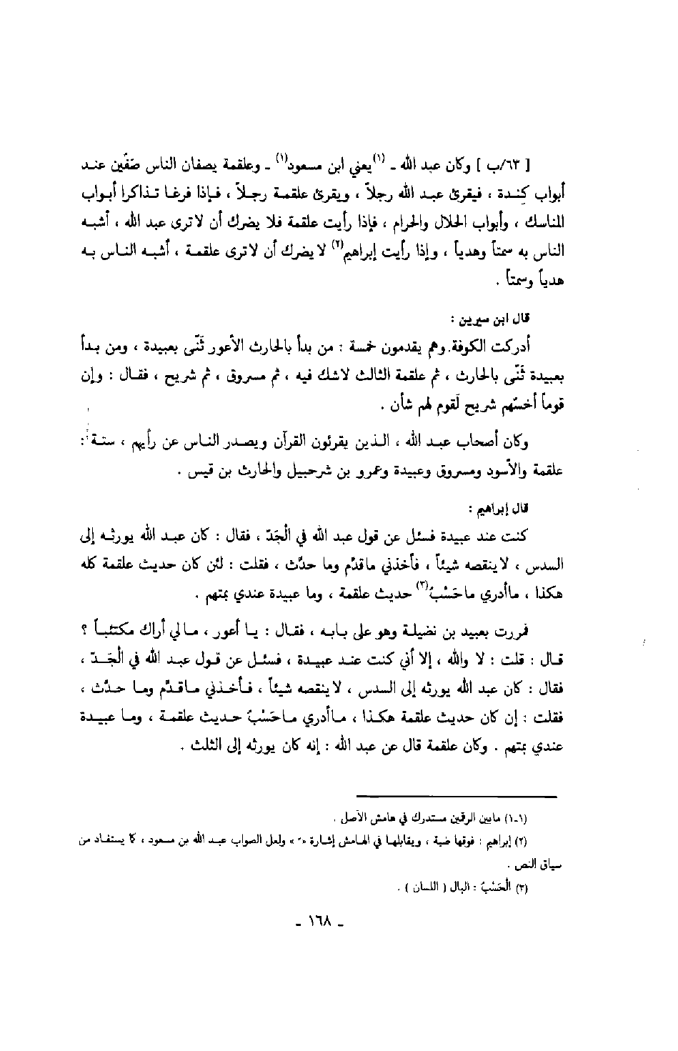 قال إبراهيم: كنت عند عبيدة فسئل عن قول عبد الله في الجدّ، فقال: كان عبد الله يورثه إلى السدس، لا ينقصه شيئاً، فأخذني ما قدّم وما حدّث، فقلت: لئن كان حديث علقمة كله هكذا، ما أدري ما حسب حديث علقمة، وما عبيدة عندي بمتهم.