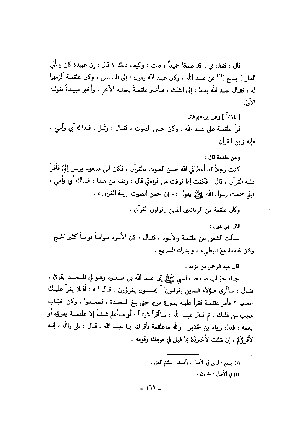 وعن إبراهيم قال: قرأ علقمة على عبد الله، وكان حسن الصوت، فقال: رتّل، فداك أبي وأمي، فإنه زين القرآن.