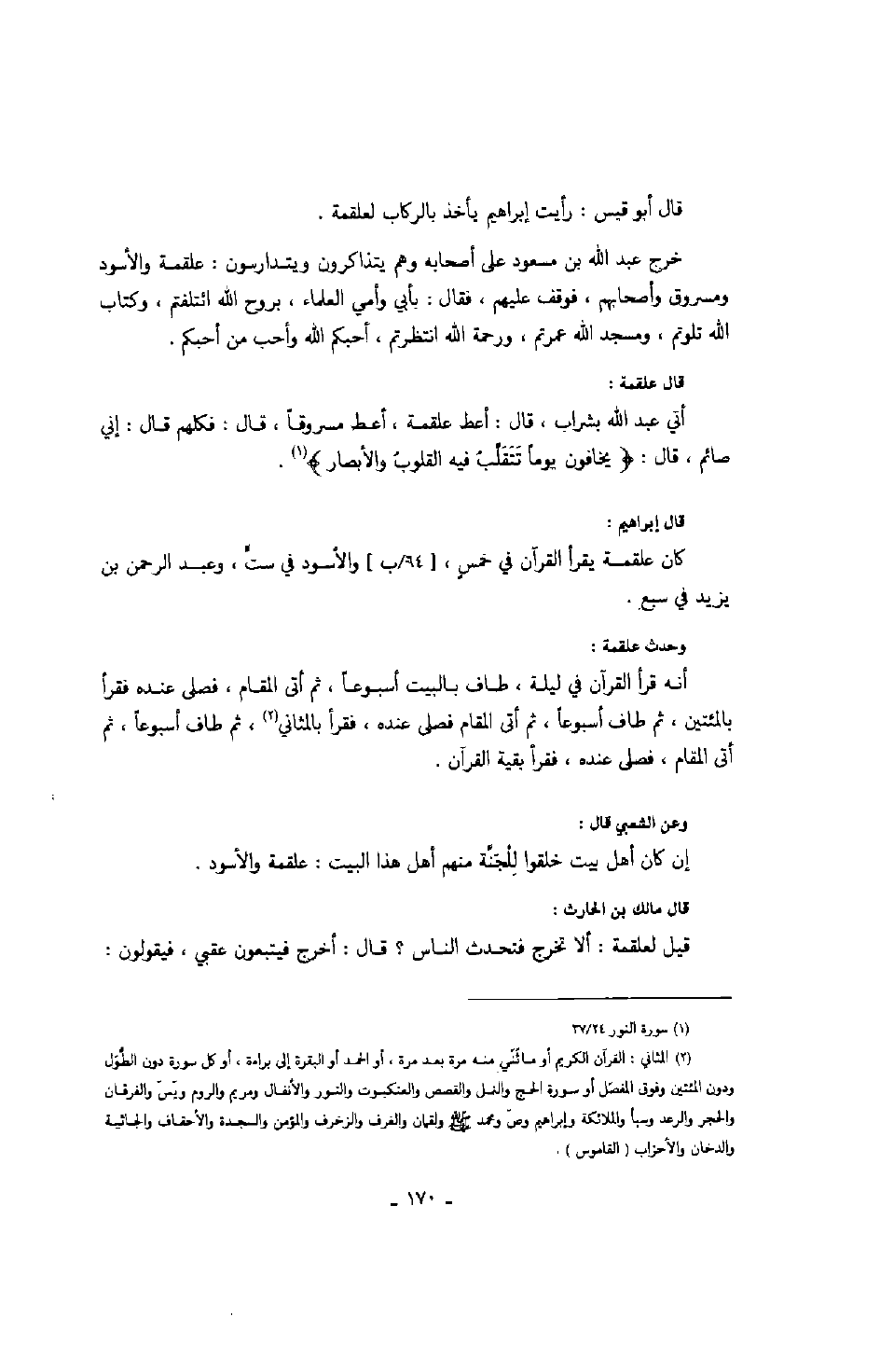 قال إبراهيم: كانعلقمة يقرأ القرآن في خمسٍ، والأسود في ستٍّ، وعبد الرحمن بن يزيد في سبع.