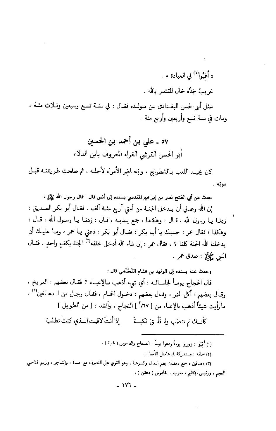 وحدث عنه بسنده إلى الوليد بن هشام القحذمي قال: قال الحجاج يوماً لجلسائه: أي شيء أذهب بالإعياء؟ فقال بعضهم: التمريخ، وقال بعضهم: أكل التمر، وقال بعضهم: دخول الحمام، فقال رجل من الدهاقين: ما رأيت شيئاً أذهب بالإعياء من النجاح، وأنشد: من الطويل