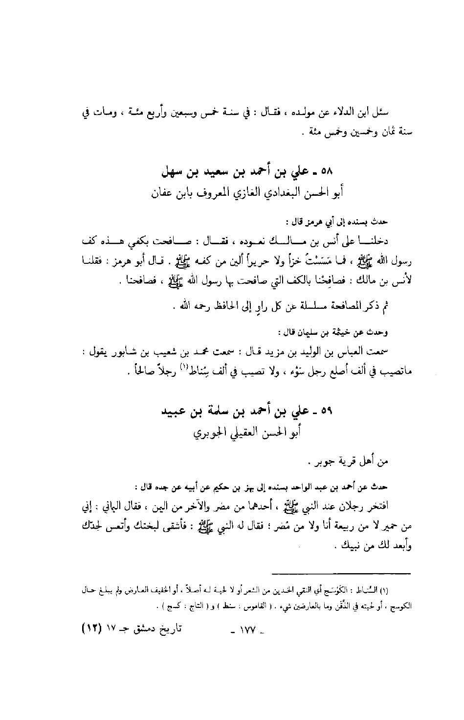 أبو الحسن البغدادي الغازي المعروف بابن عفان حدث بسنده إلى أبي هرمز قال: دخلنا على أنس بن مالك نعوده، فقال: صافحت بكفي هذه كف رسول الله صلّى الله عليه وسلّم، فما مسست خزاً ولا حريراً ألين من كفه صلّى الله عليه وسلّم. قال أبو هرمز: فقلنا لأنس بن مالك: فصافحنا بالكف التي صافحت بها رسول الله صلّى الله عليه وسلّم، فصافحنا.