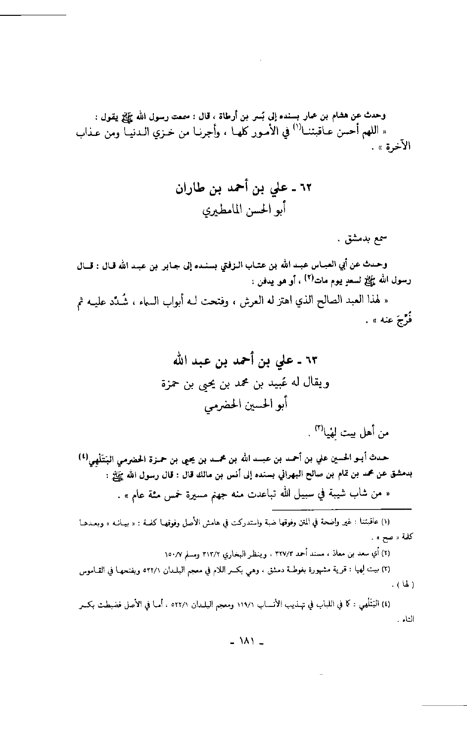 حدث أبو الحسين علي بن أحمد بن عبد الله بن محمد بن يحيى بن حمزة الحضرمي البتلهي بدمشق عن محمد بن تمام بن صالح البهراني بسنده إلى أنس بن مالك قال: قال رسول الله صلّى الله عليه وسلّم: " من شاب شيبة في سبيل الله تباعدت منه جهنم مسيرة خمس مئة عام ".