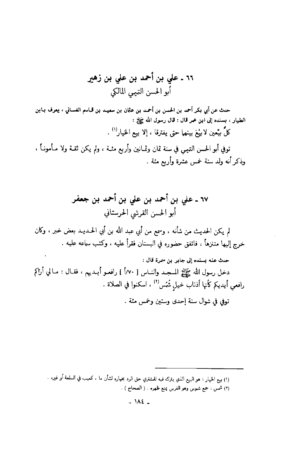 أبو الحسن التميمي المالكي حدث عن أبي بكر أحمد بن الحسن بن أحمد بن عثمان بن سعيد بن قاسم الغساني، يعرف بابن الطيار، بسنده إلى ابن عمر قال: قال رسول الله صلّى الله عليه وسلّم: " كلّ بيّعين لا بيع بينهما حتى يفترقا، إلا بيع الخيار ".