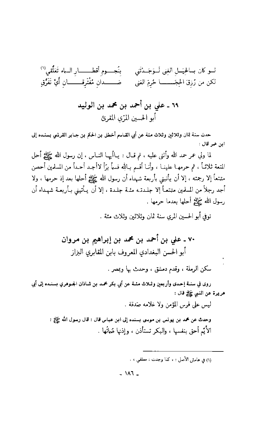 أبو الحسين المرّي المقرئ حدث سنة ثمان وثلاثين وثلاث مئة عن أبي القاسم أخطل بن الحكم بن جابر القرشي بسنده إلى ابن عمر قال: لما ولي عمر حمد الله وأثنى عليه، ثم قال: يا أيها الناس، إن رسول الله صلّى الله عليه وسلّم أحل المتعة ثلاثاً، ثم حرمها علينا، وأنا أقسم بالله قسماً برّاً لا أجد أحداً من المسلمين أحصن متمتعاً إلا رجمته، إلا أن يأتيني بأربعة شهداء أن رسول الله صلّى الله عليه وسلّم أحلها بعد إذ حرمها، ولا أجد رجلاً من المسلمين متمتعاً إلا جلدته مئة جلدة، إلا أن يأتيني بأربعة شهداء أن رسول الله صلّى الله عليه وسلّم أحلها بعدما حرمها.
