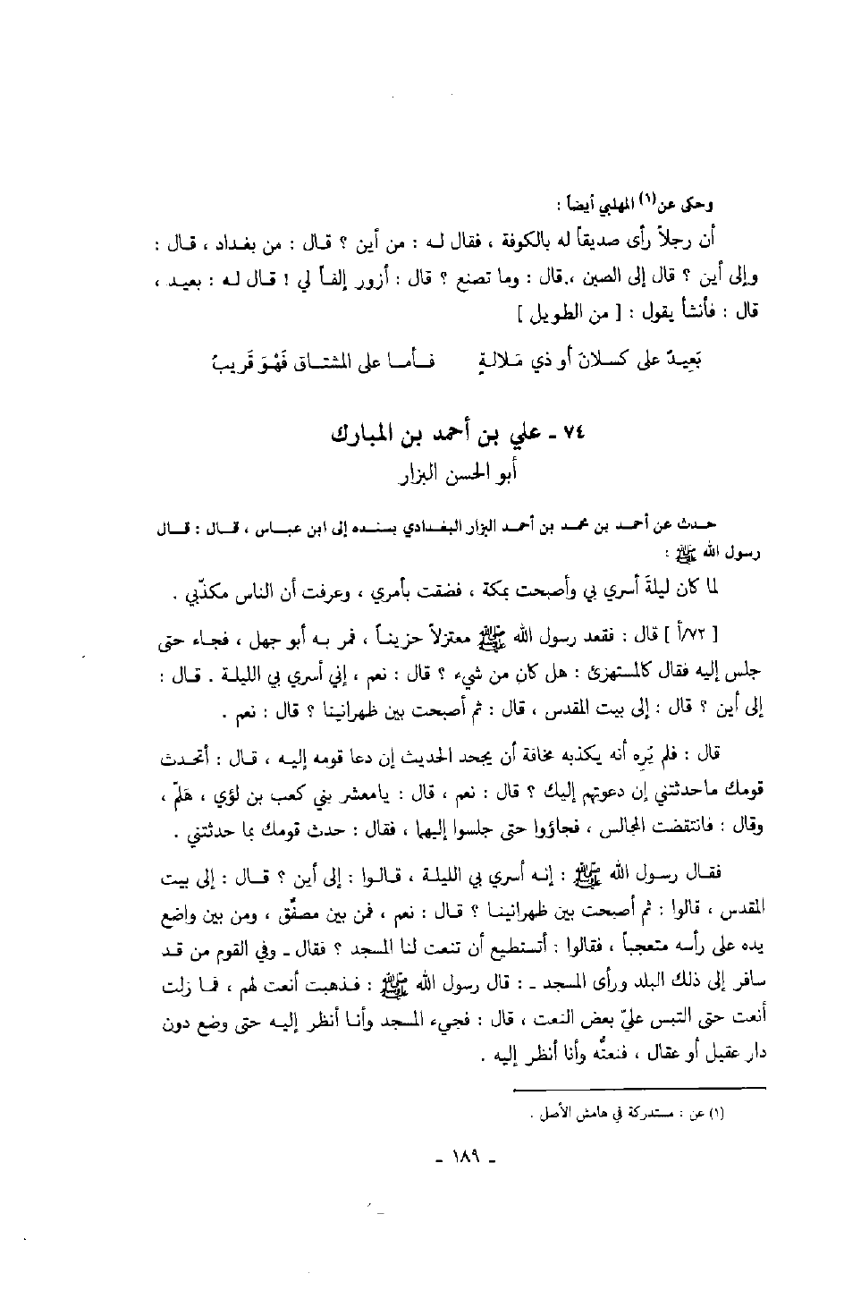أبو الحسن البزار حدث عن أحمد بن محمد بن أحمد البزار البغدادي بسنده إلى ابن عباس، قال: قال رسول الله صلّى الله عليه وسلّم: " لما كان ليلة أسري بي وأصبحت بمكة، فضقت بأمري، وعرفت أن الناس مكذّبي ".