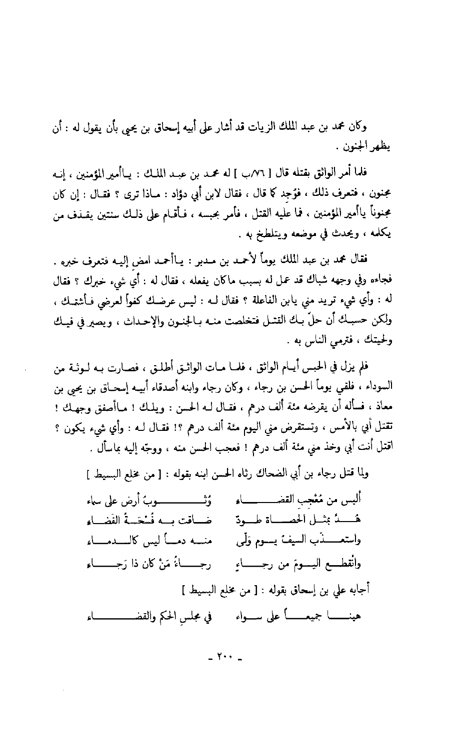 فقال محمد بن عبد الملك يوماً لأحمد بن مدبر: يا أحمد امض إليه فتعرف خبره. فجاءه وفي وجهه شباك قد عمل له بسبب ما كان يفعله، فقال له: أي شيء خبرك؟ فقال له: وأي شيء تريد مني يا بن الفاعلة؟ فقال له: ليس عرضك كفواً لعرضي فأشتمك، ولكن حبسك أن حلّ بك القتل فتخلصت منه بالجنون والإحداث، ويصير في فيك ولحيتك، فترمي الناس به.