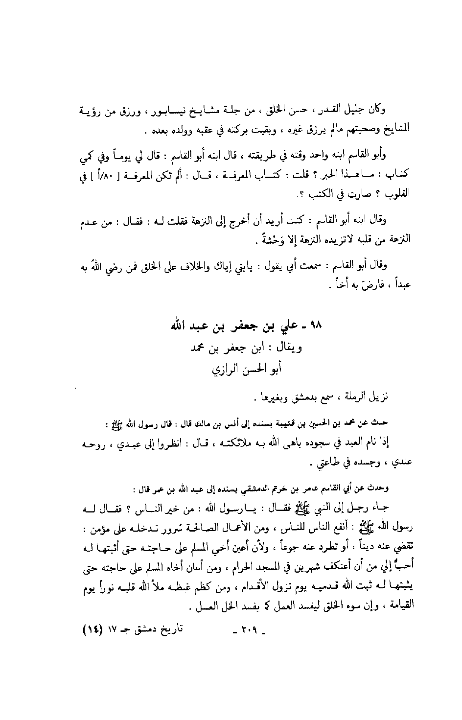 وحدث عن أبي القاسم عامر بن خرتم الدمشقي بسنده إلى عبد الله بن عمر قال: جاء رجل إلى النبي صلّى الله عليه وسلّم فقال: يا رسول الله: من خير الناس؟ فقال له رسول الله صلّى الله عليه وسلّم: أنفع الناس للناس، ومن الأعمال الصالحة سرور تدخله على مؤمن: تقضي عنه ديناً، أو تطرد عنه جوعاً، ولأن أعين أخي المسلم على حاجته حتى أثبتها له أحبّ إلي من أن أعتكف شهري في المسجد الحرام، ومن أعان أخاه المسلم على حاجته حتى يثبتها له ثبت الله قدميه يوم تزول الأقدام، ومن كظم غيظه ملأ الله قلبه نوراً يوم القيامة، وإن سوء الخلق ليفسد العمل كما يفسد الخل العسل ".