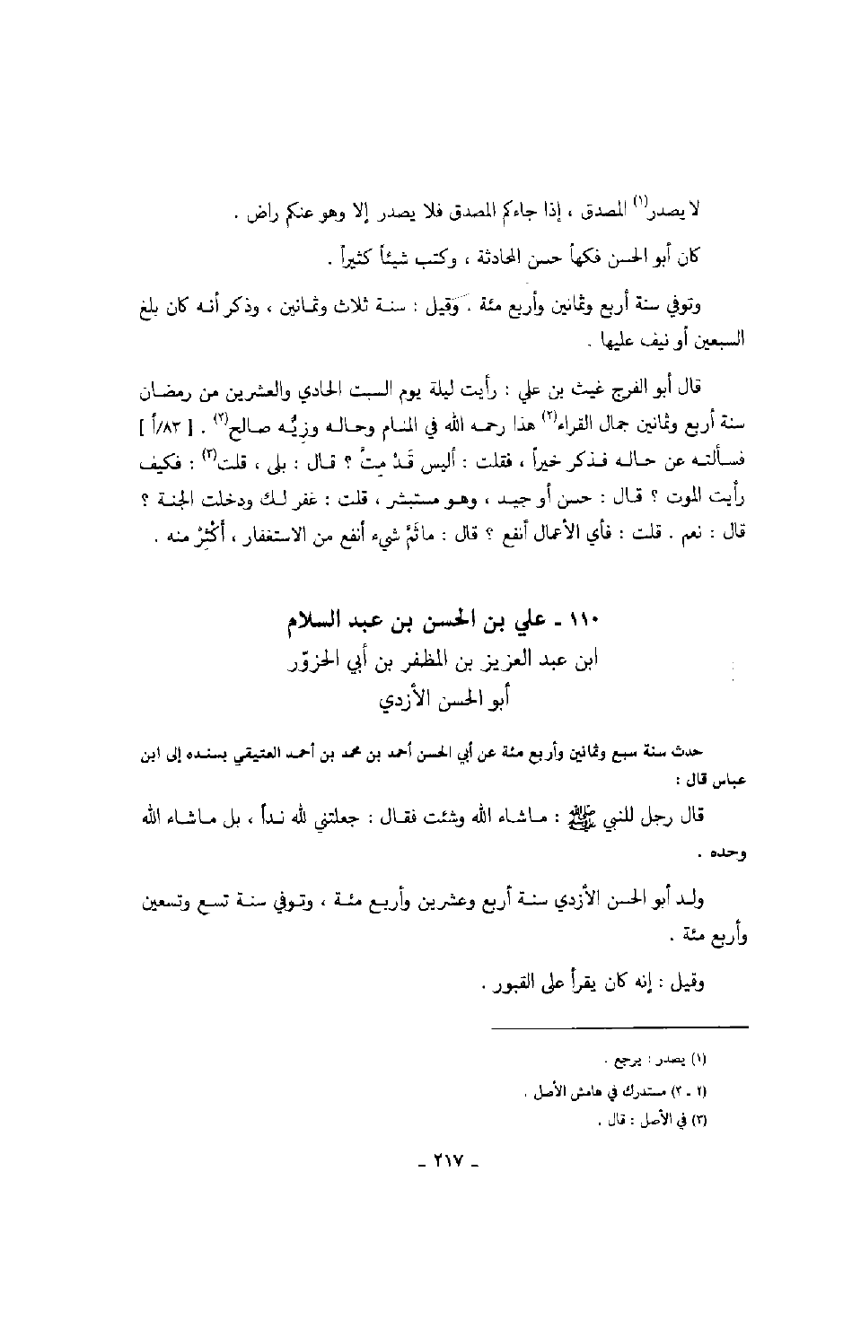 ابن عبد العزيز بن المظفر بن أبي الحزوّر أبو الحسن الأزدي حدث سنة سبع وثمانين وأربع مئة عن أبي الحسن أحمد بن محمد بن أحمد العتيقي بسنده إلى ابن عباس قال: قال رجل للنبي صلّى الله عليه وسلّم: ما شاء الله وشئت فقال: " جعلتني لله نداً، بل ما شاء الله وحده ".