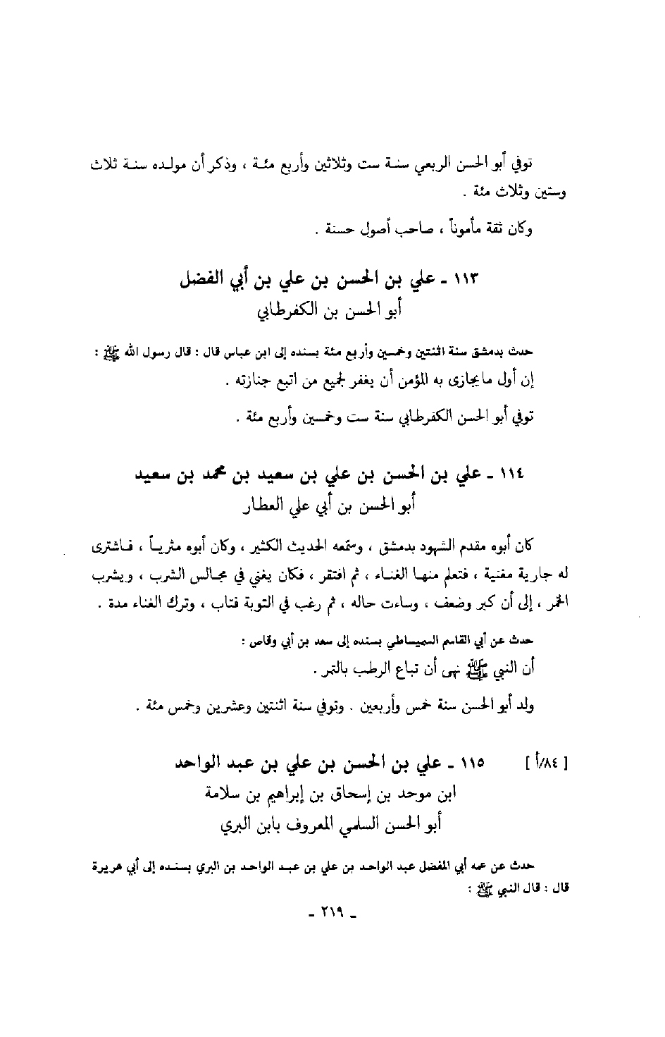 أبو الحسن بن الكفرطابي حدث بدمشق سنة اثنتين وخمسين وأربع مئة بسنده إلى ابن عباس قال: قال رسول الله صلّى الله عليه وسلّم: " إن أول ما يجازى به المؤمن أن يغفر لجميع من اتبع جنازته ".
