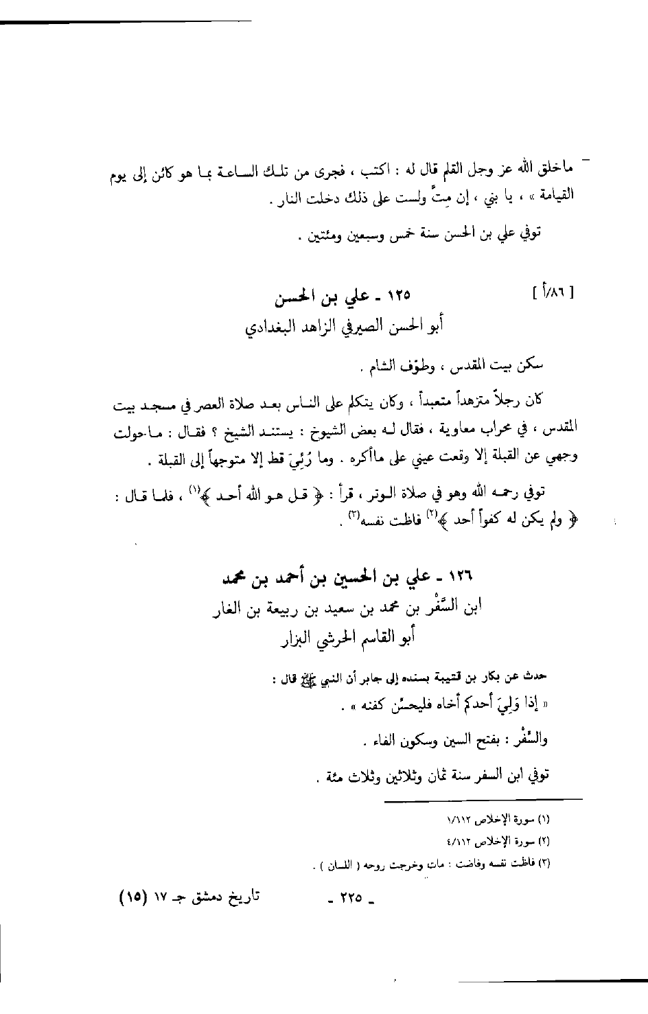 ابن السّفر بن محمد بن سعيد بن ربيعة بن الغار أبو القاسم الحرشي البزار حدث عن بكار بن قتيبة بسنده إلى جابر أن النبي صلّى الله عليه وسلّم قال: " إذا ولي أحدكم أخاه فليحسّن كفنه ".
