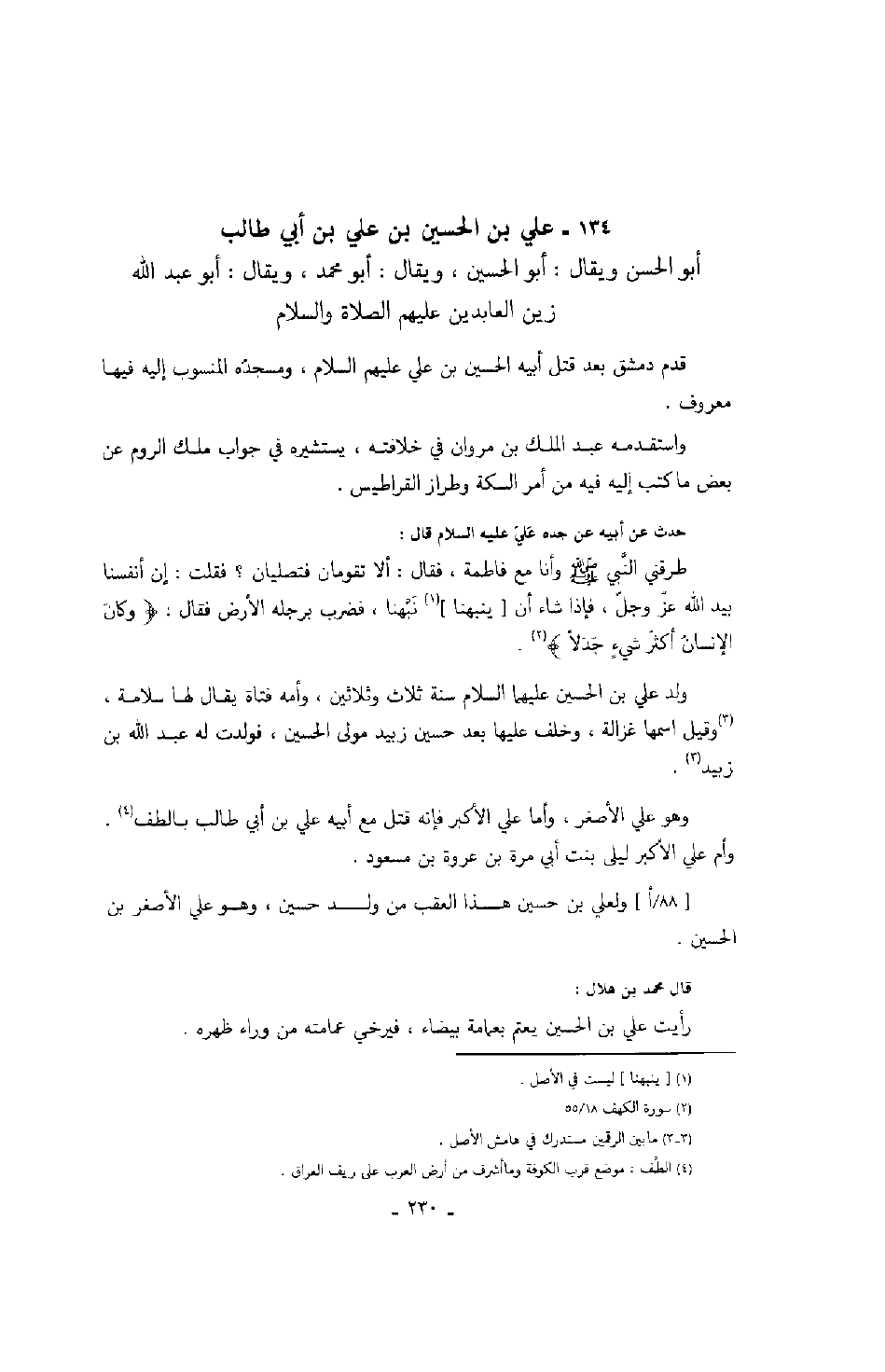 أبو الحسن ويقال: أبو الحسين، ويقال: أبو محمد، ويقال: أبو عبد الله زين العابدين عليهم الصلاة والسلام قدم دمشق بعد قتل أبيه الحسين بن علي عليهم السلام، ومسجده المنسوب إليه فيها معروف.
