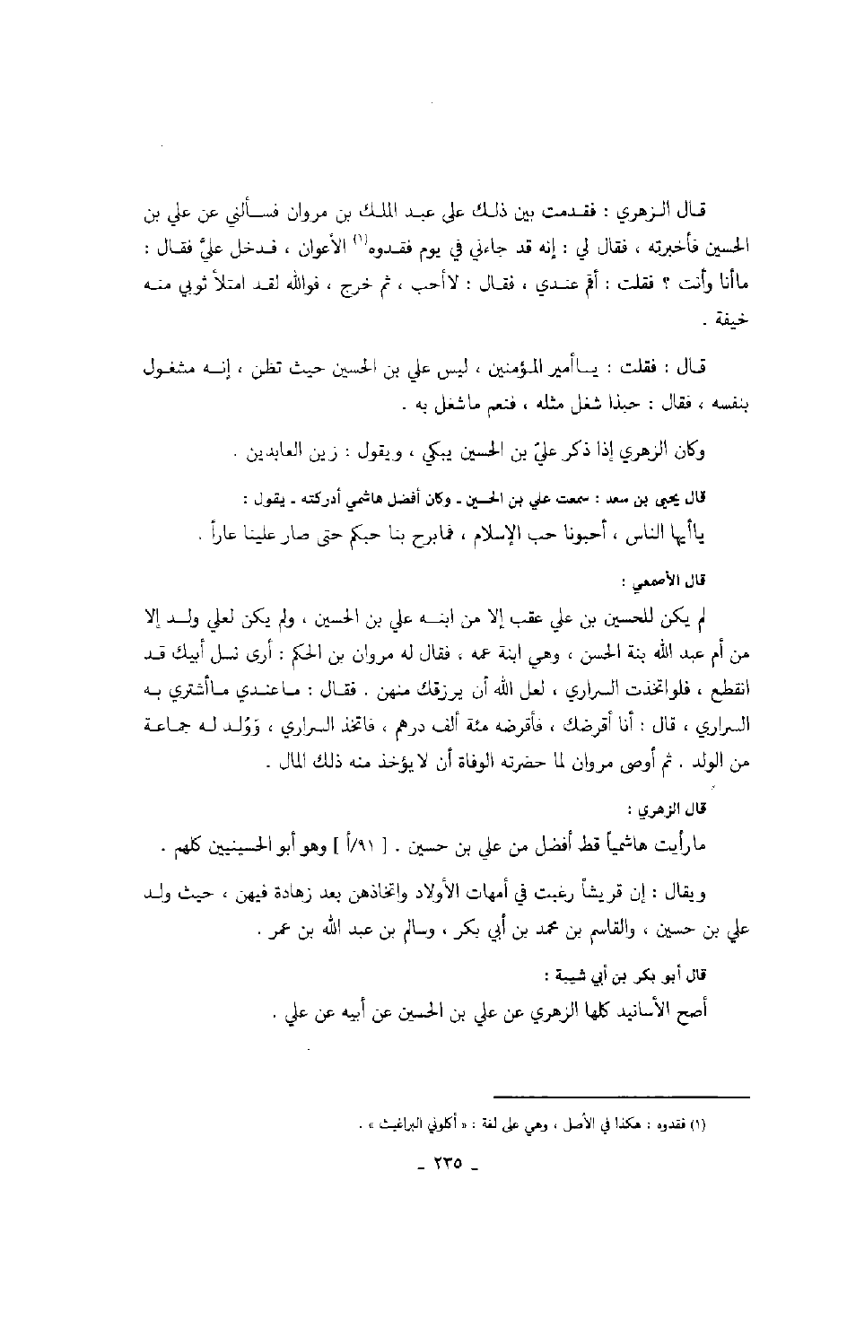 قال الأصمعي: لم يكن للحسين بن علي عقب إلا من ابنه علي بن الحسين، ولم يكن لعلي ولد إلا من أم عبد الله بنة الحسن، وهي ابنة عمه، فقال له مروان بن الحكم: أرى نسل أبيك قد انقطع، فلو اتخذت السراري، لعل الله أن يرزقك منهن، فقال: ما عندي ما أشتري به السراري، قال: أنا أقرضك، فأقرضه مئة ألف درهم، فاتخذ السراري، وولد له جماعة من الولد. ثم أوصى مروان لما حضرته الوفاة أن لا يؤخذ منه ذلك المال.