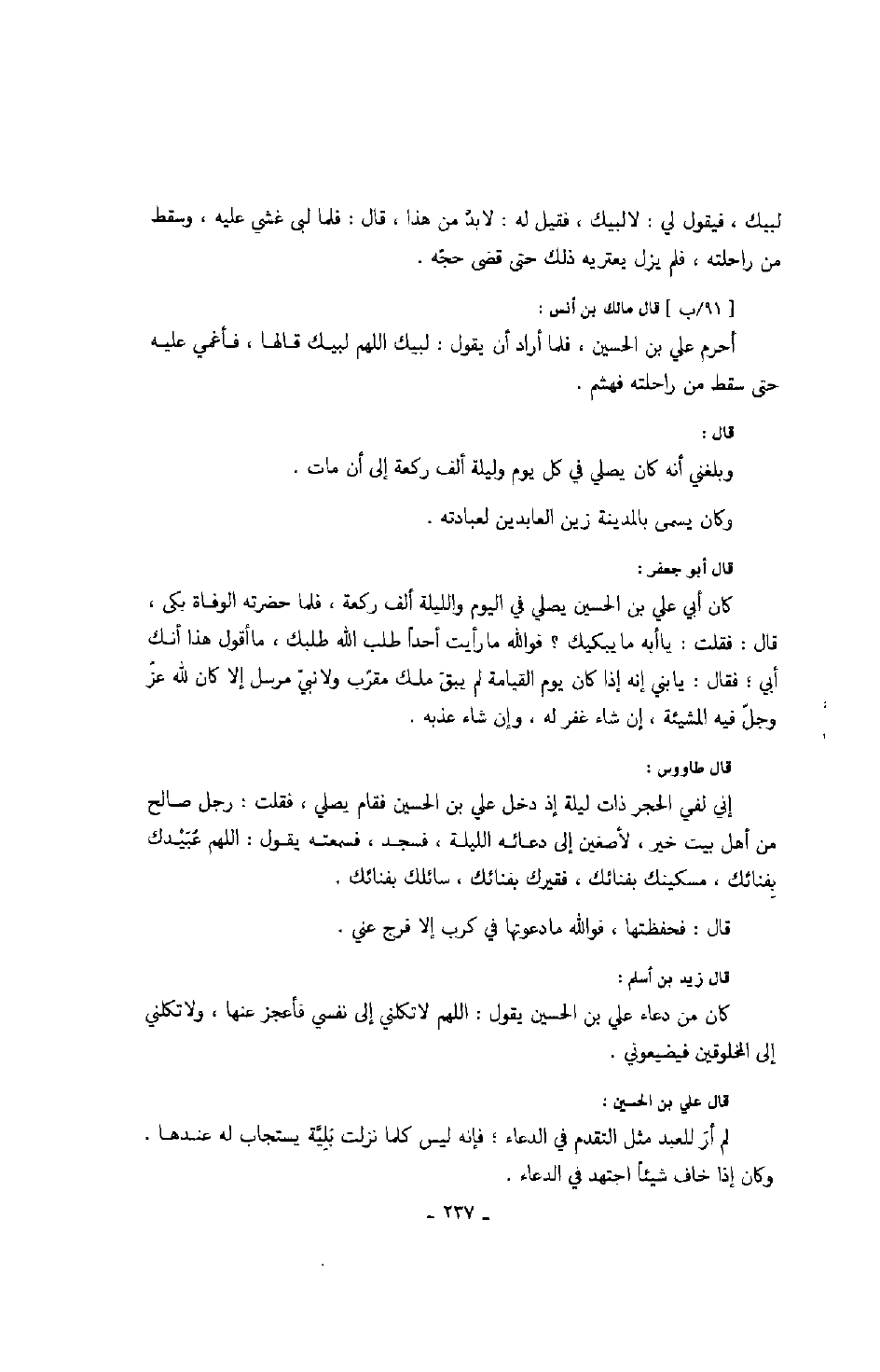 قال مالك بن أنس: أحرم علي بن الحسين، فلما أراد أن يقول: لبيك اللهم لبيك قالها، فأغمي عليه حتى سقط من راحلته فهشم.