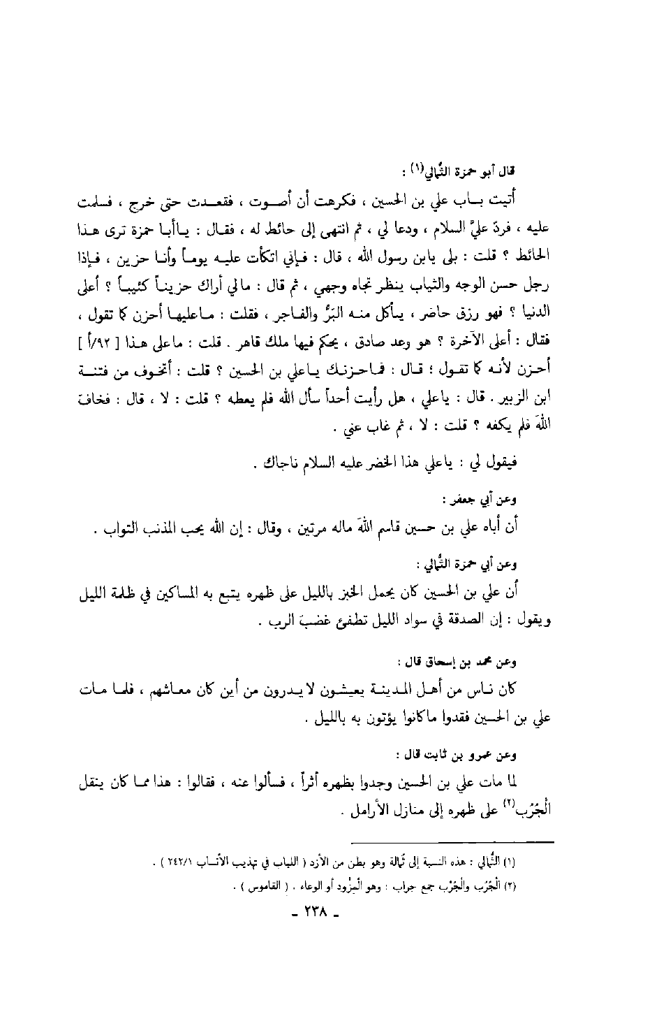 وعن عمرو بن ثابت قال: لما مات علي بن الحسين وجدوا بظهره أثراً، فسألوا عنه، فقالوا: هذا مما كان ينقل الجرب على ظهره إلى منازل الأرامل.