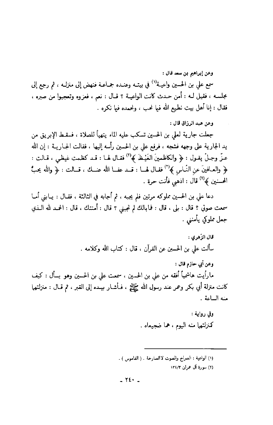 وعن عبد الرازق قال: جعلت جارية لعلي بن الحسين تسكب عليه الماء يتهيأ الصلاة، فسقط الإبريق من يد الجارية على وجهه فشجه، فرفع علي بن الحسين رأسه إليها، فقالت الجارية: إن الله عزّ وجلّ يقول: " والكاظمين الغيظ " فقال لها: قد كظمت غيظي، قالت: " والعافين عن النّاس " فقال لها: قد عفا الله عنك، قالت: " والله يحبّ المحسنين " قال: اذهبي فأنت حرة.