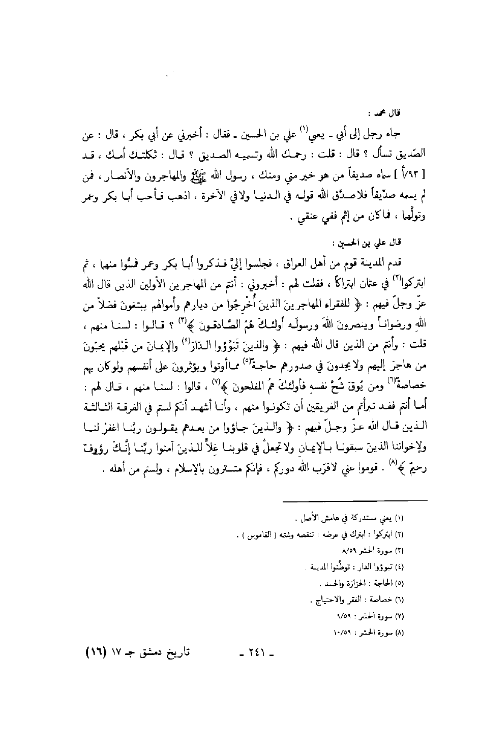 قال محمد: جاء رجل إلى أبي يعني علي بن الحسين فقال: أخبرني عن أبي بكر، قال: عن الصّديق تسأل؟ قال: قلت: رحمك الله وتسميه الصديق؟ قال: ثكلتك أمك، قد سماه صديقاً من هو خير مني ومنك، رسول الله صلّى الله عليه وسلّم والمهاجرون والأنصار، فمن لم يسمه صدّيقاً فلا صدّق الله قوله في الدنيا ولا في الآخرة، اذهب فأحب أبا بكر وعمر وتولّهما، فما كان من إثم ففي عنقي.