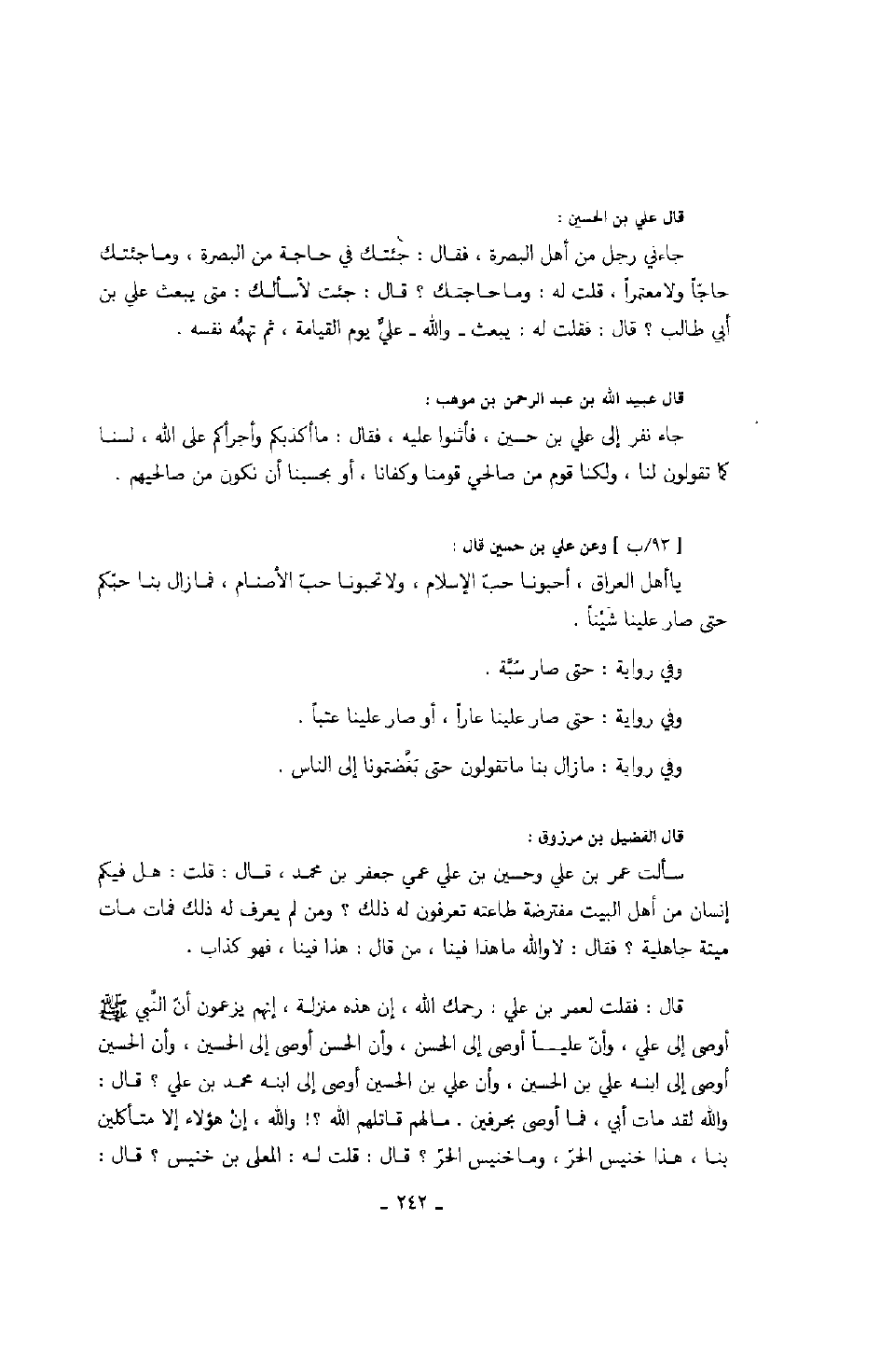 قال: فقلت لعمر بن علي: رحمك الله، إن هذه منزلة، إنهم يزعمون أنّ النّبي صلّى الله عليه وسلّم أوصى إلى علي، وأنّ علياً أوصى إلى الحسن، وأن الحسن أوصى إلى الحسين، وأن الحسين أوصى إلى ابنه علي بن الحسين، وأن علي بن الحسين أوصى إلى ابنه محمد بن علي؟ قال: والله لقد مات أبي، فما أوصى بحرفين. ما لهم قاتلهم الله؟! والله، إن هؤلاء إلا متأكلين بنا، هذا خنيس الحرّ، وما خنيس الحر؟ قال: قلت له: المعلى بن خنيس؟ قال: