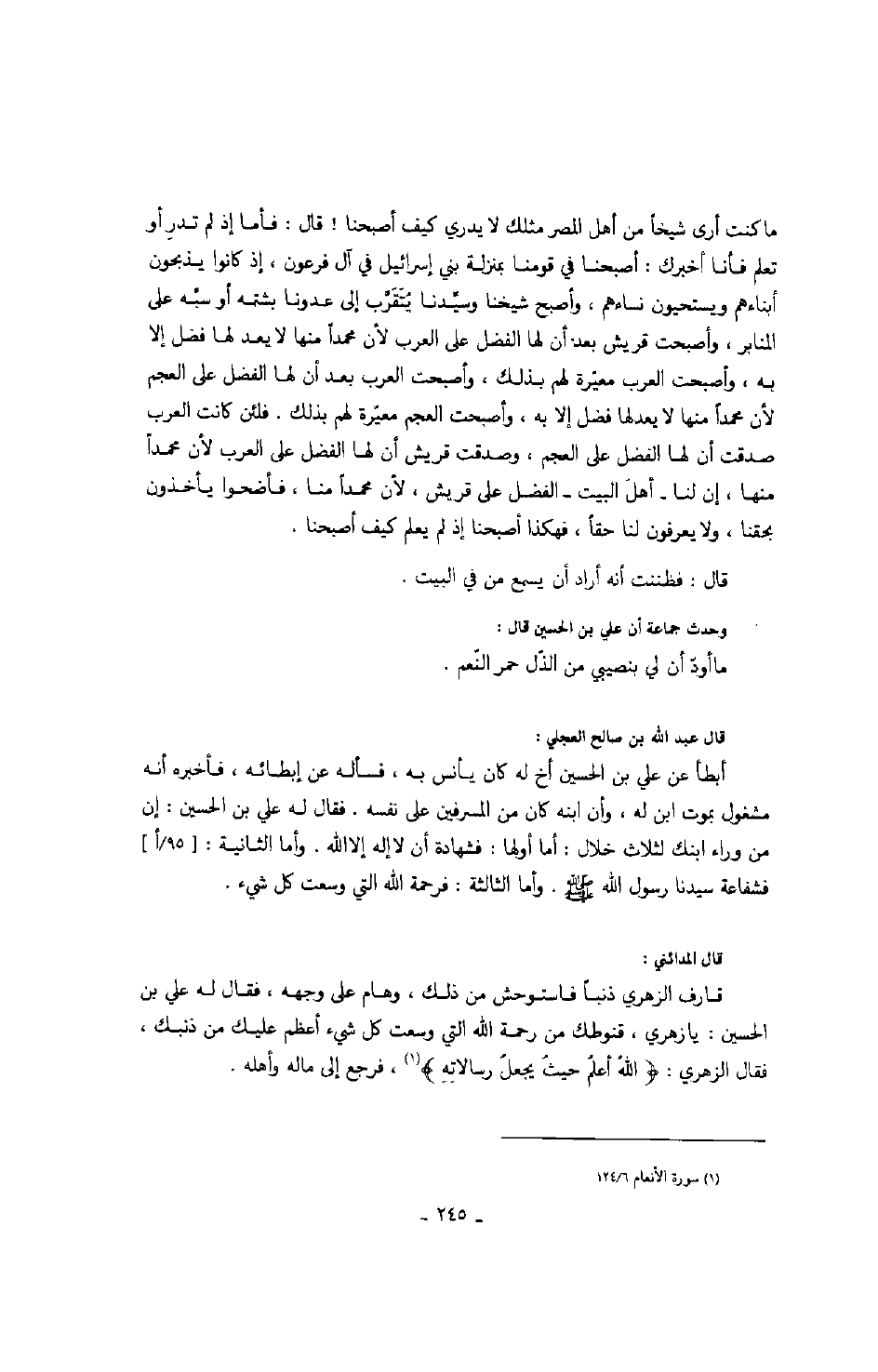 ما كنت أرى شيخاً من أهل المصر مثلك لا يدري كيف أصبحنا! قال: فأما إذ لم تدر أو تعلم فأنا أخبرك: أصبحنا في قومنا بمنزلة بني إسرائيل في آل فرعون، إذ كانوا يذبحون أبناءهم ويستحيون نساءهم، وأصبح شيخنا وسيّدنا يتقرّب إلى عدونا بشتمه أو سبّه على المنابر، وأصبحت قريش بعد أن لها الفضل على العرب لأن محمداً منها لا يعد لها فضل إلا به، وأصبحت العرب معيّرة لهم بذلك، وأصبحت العرب بعد أن لها الفضل على العجم لأن محمداً منها لا يعد لها فضل إلا به، وأصبحت العجم معيّرة لهم بذلك. فلئن كانت العرب صدقت أن لها الفضل على العجم، وصدقت قريش أن لها الفضل على العرب لأن محمداً منها، إن لنا أهل البيت الفضل على قريش، لأن محمداً منا، فأضحوا يأخذون بحقنا، ولا يعرفون لنا حقاً، فهكذا أصبحنا إذ لم يعلم كيف أصبحنا.