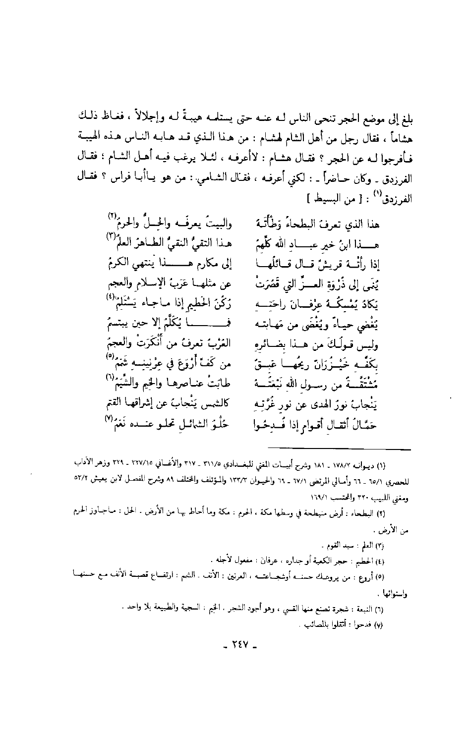 بلغ إلى موضع الحجر تنحى الناس له عنه حتى يستلمه هيبةً له وإجلالاً، فغاظ ذلك هشاماً، فقال رجل من أهل الشام لهشام: من هذا الذي قد هابه الناس هذه الهيبة فأفرجوا له عن الحجر؟ فقال هشام: لا أعرفه، لئلا يرغب فيه أهل الشام؛ فقال الفرزدق وكان حاضراً: لكني أعرفه، فقال الشامي: من هو يا أبا فراس؟ فقال الفرزدق: من البسيط