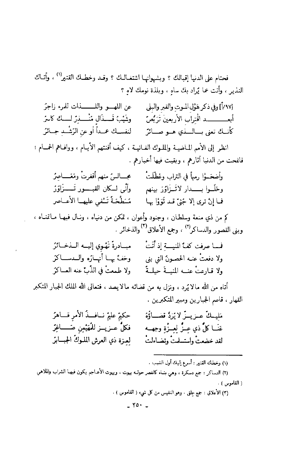 كم من ذي منعة وسلطان، وجنود وأعوان، تمكن من دنياه، ونال فيها ما تمناه، وبنى القصور والدساكر، وجمع الأعلاق والذخائر.