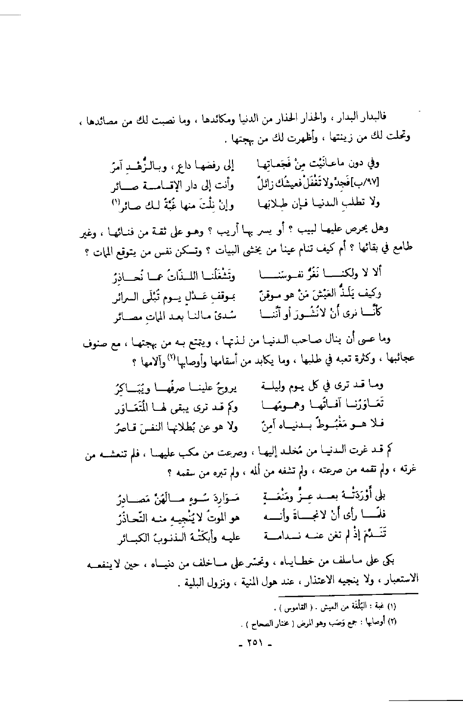 فلا هو مغبوطٌ بدنياه آمنٌ ... ولا هو عن بطلانها النفس قاصر