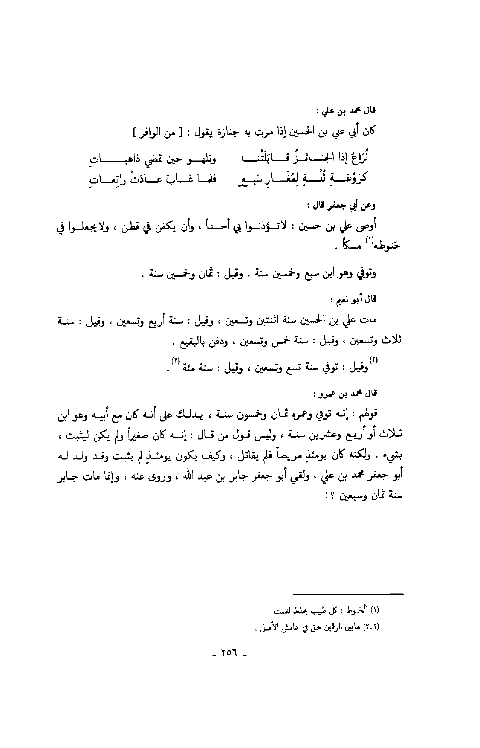 قال محمد بن علي: كان أبي علي ين الحسين إذا مرت به جازة يقول: من الوافر