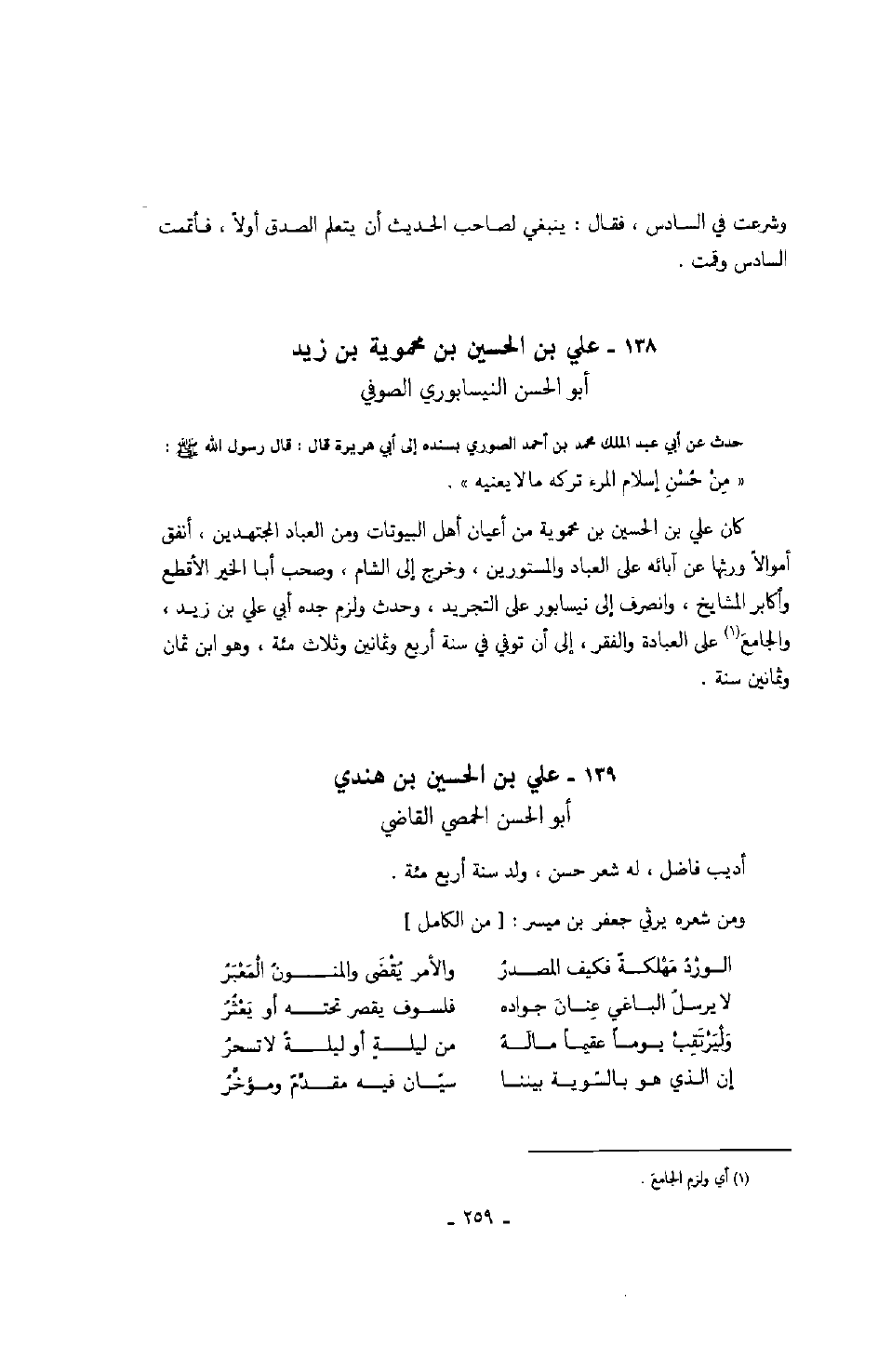 أبو الحسن النيسابوري الصوفي حدث عن أبي عبد الملك محمد بن أحمد الصوري بسنده إلى أبي هريرة قال: قال رسول الله صلّى الله عليه وسلّم: " من حسن إسلام المرء تركه ما لا يعنيه ".