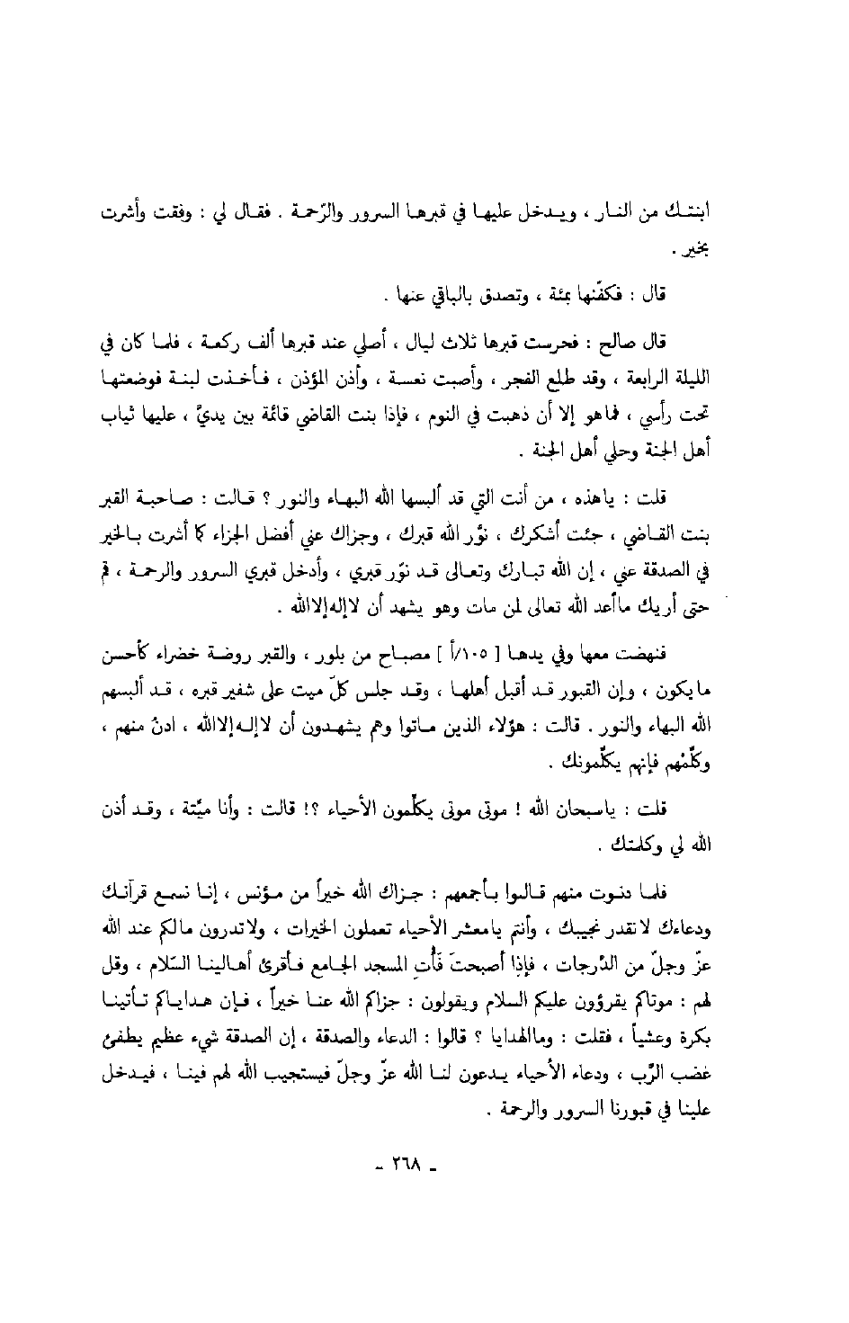 قلت: يا هذه، من أنت التي قد ألبسها الله البهاء والنور؟ قال: صاحبة القبر بنت القاضي، جئت أشكرك، نوّر الله قبرك، وجزاك عني أفضل الجزاء كما أشرت بالخير في الصدقة عني، إن الله تبارك وتعالى قد نوّر قبري، وأدخل قبري السرور والرحمة، قم حتى أريك ما أعد الله تعالى لمن مات وهو يشهد أن لا إله إلا الله.
