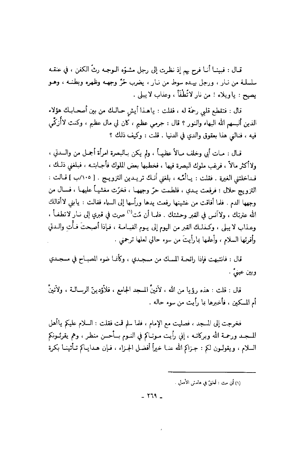 قال: فبينا أنا فرح بهم إذ نظرت إلى رجل مشوّه الوجه رثّ الكفن، في عنقه سلسلة من نار، ورجل بيده سوط من نار، يضرب حرّ وجهه وظهره وبطنه، وهو يصيح: يا ويلاه! من نار لا تطفأ، وعذاب لا يبلى.