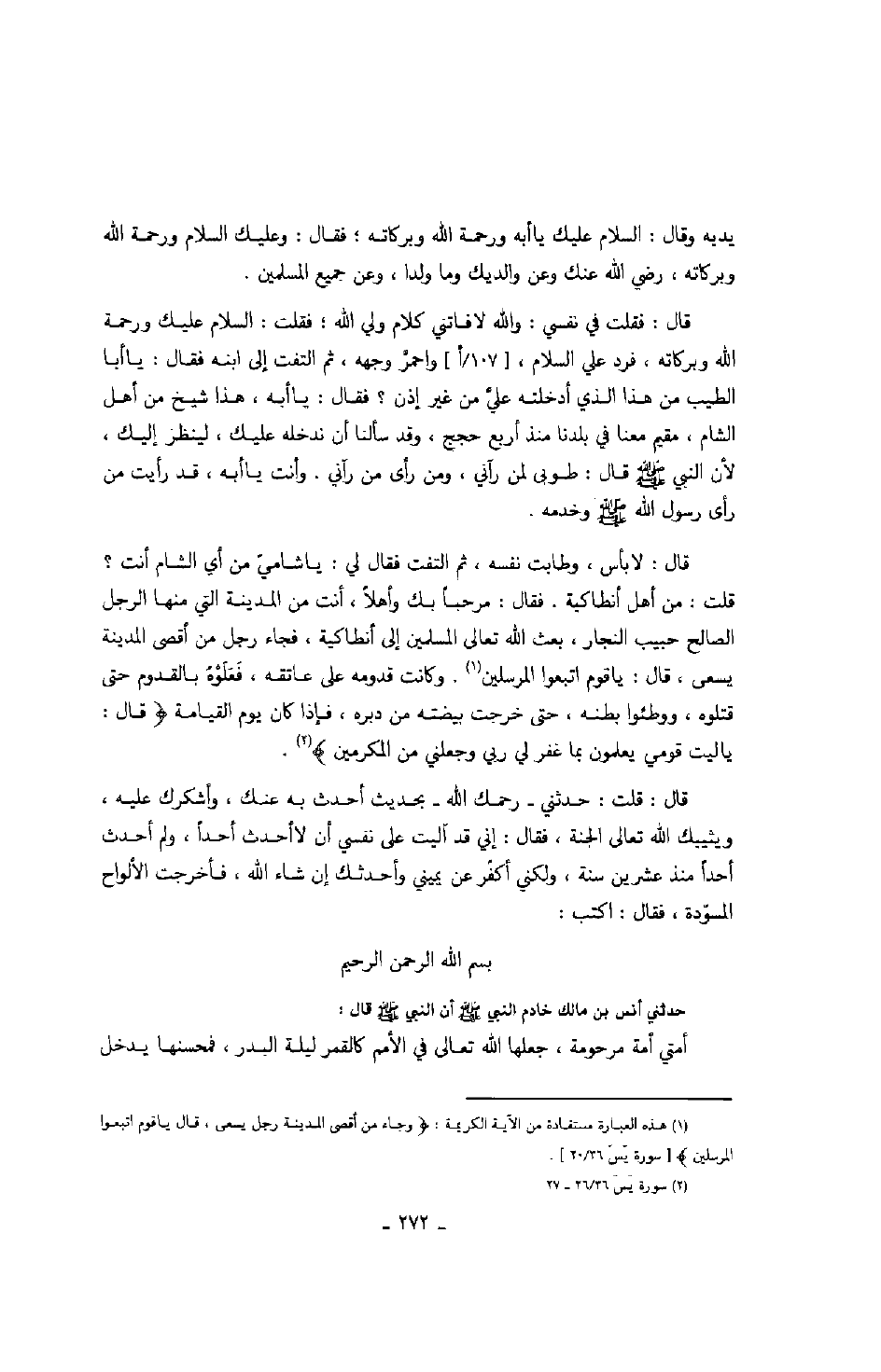 قال: لا بأس، وطابت نفسه، ثم التفت فقال لي: يا شاميّ من أي الشام أنت؟ قلت: من أهل أنطاكية. فقال: مرحباً بك وأهلاً، أنت من المدينة التي منها الرجل الصالح حبيب النجار، بعث الله تعالى المسلمين إلى أنطاكية، فجاء رجل من أقصى المدينة يسعى، قال: يا قوم اتبعوا المرسلين. وكانت قدومه على عاتقه، فعلوه بالقدوم حتى قتلوه، ووطئوا بطنه، حتى خرجت بيضته من دبره، فإذا كان يوم القيامة: " قال: يا ليت قومي يعلمون بما غفر لي ربي وجعلني من المكرمين ".
