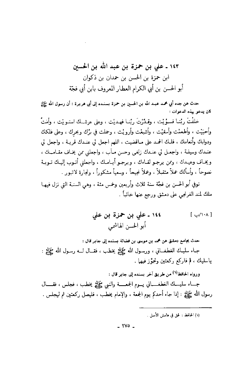 أبو الحسن الهاشمي حدث بجامع بدمشق عن محمد بن موسى بن فضالة بسنده إلى جابر قال: جاء سليك الغطفاني، ورسول الله صلّى الله عليه وسلّم يخطب، فقال له رسول الله صلّى الله عليه وسلّم: " يا سليك، قم فاركع ركعتين وتجوّز فيهما ".