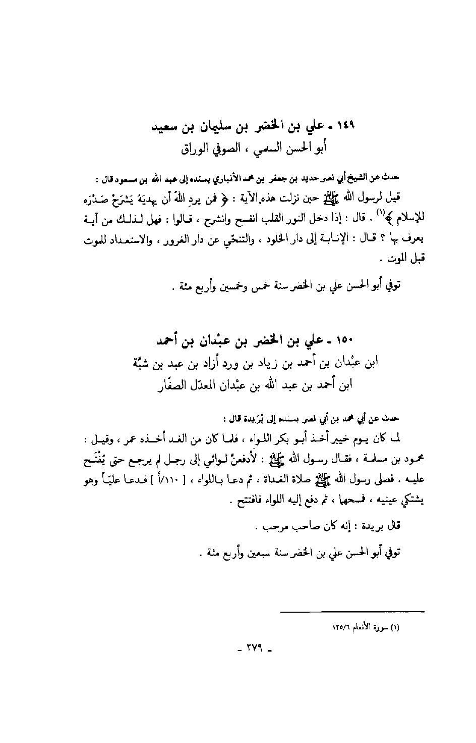 أبو الحسن السلمي، الصوفي الوراق حدث عن الشيخ أبي نصر حديد بن جعفر بن محمد الأنباري بسنده إلى عبد الله بن مسعود قال: قيل لرسول الله صلّى الله عليه وسلّم حين نزلت هذه الآية: " فمن يرد الله أن يهديه يشرح صدره للإسلام ". قال: إذا دخل النور القلب انفسح وانشرح، قالوا: فهل لذلك من آية يعرف بها؟ قال: الإنابة إلى دار الخلود، والتنحّي عن دار الغرور، والاستعداد للموت قبل الموت.