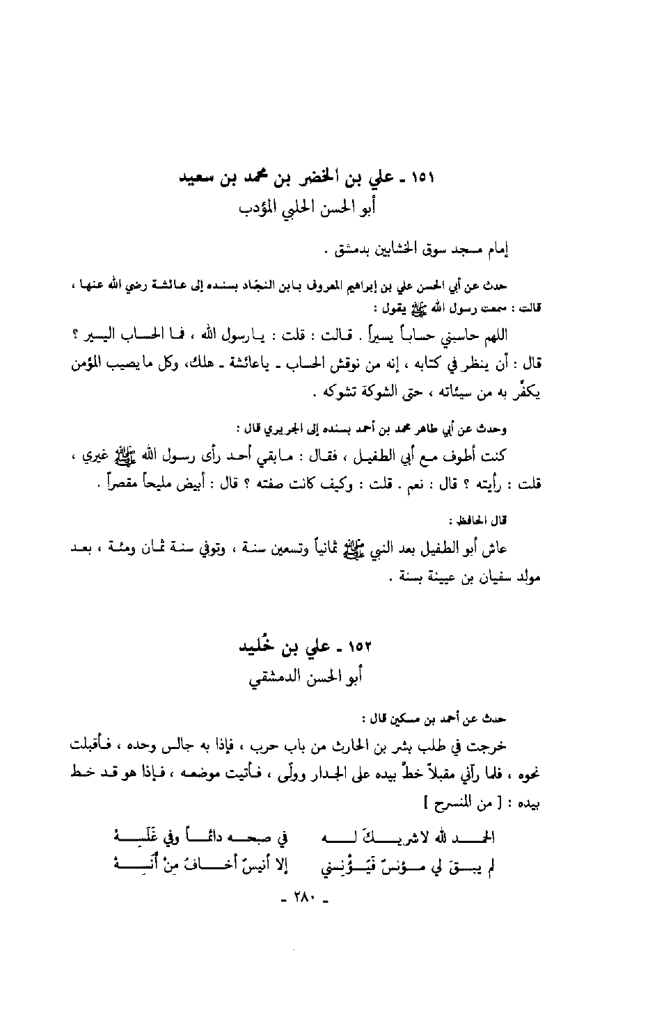 وحدث عن أبي طاهر محمد بن أحمد بسنده إلى الجريري قال: كنت أطوف مع أبي الطفيل، فقال: ما بقي أحد رأى رسول الله صلّى الله عليه وسلّم غيري، قلت: رأيته؟ قال: نعم. قلت: وكيف كانت صفته؟ قال: أبيض مليحاً مقصراً.
