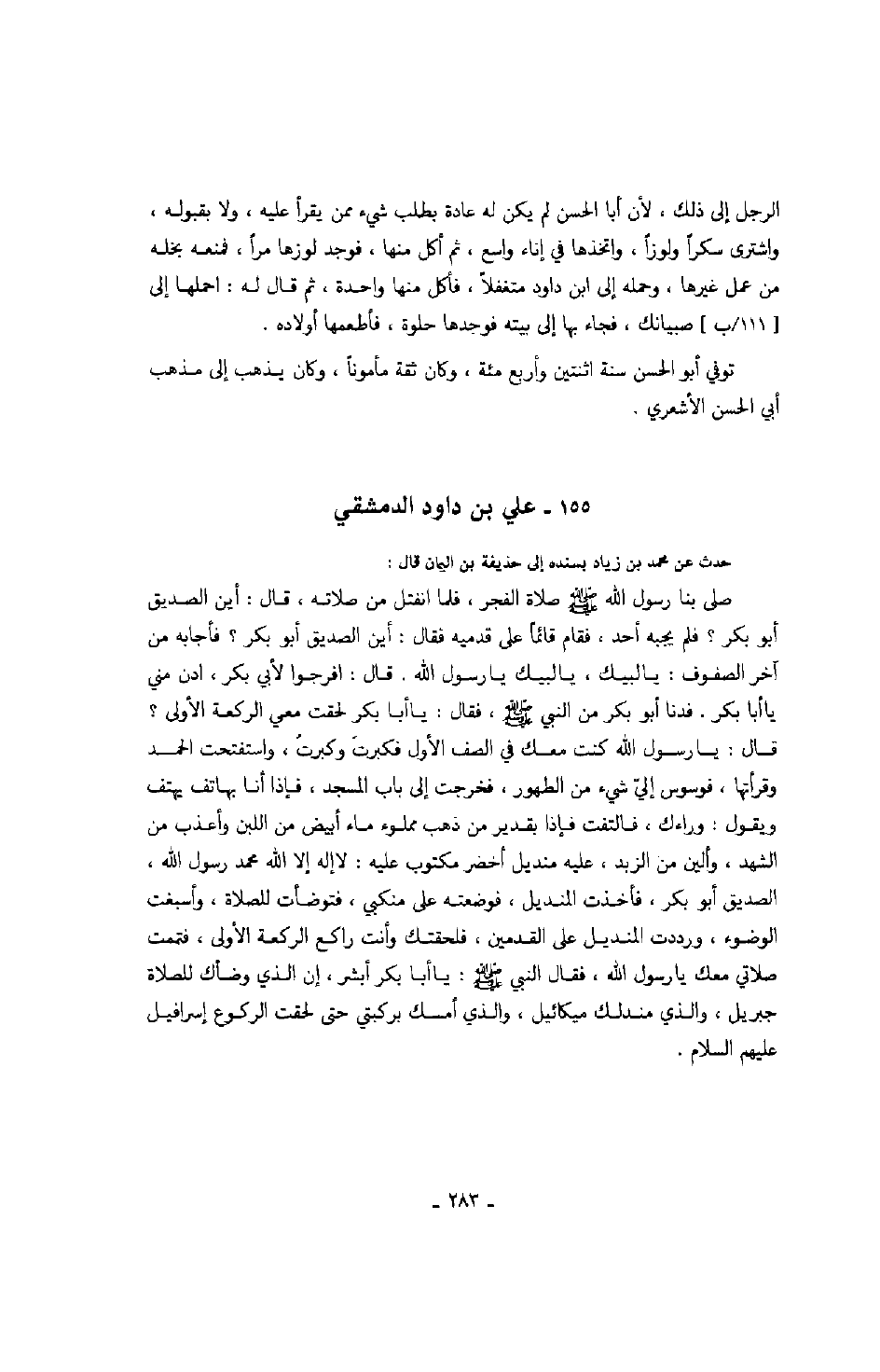 حدث عن محمد بن زياد بسنده إلى حذيفة بن اليمان قال: صلى بنا رسول الله صلّى الله عليه وسلّم صلاة الفجر، فلما انفتل من صلاته، قال: " أين الصديق أبو بكر؟ " فلم يجبه أحد، فقام قائماً على قدميه فقال: " أين الصديق أبو بكر؟ " فأجابه من آخر الصفوف: يا لبيك، يا لبيك يا رسول الله. قال: " افرجوا لأبي بكر، ادن مني يا أبا بكر ". فدنا أبو بكر من النبي صلّى الله عليه وسلّم، فقال: " يا أبا بكر لحقت معي الركعة الأولى؟ " قال: يا رسول الله كنت معك في الصف الأول فكبرت وكبرت، واستفتحت الحمد وقرأتها، فوسوس إليّ شيء من الطهور، فخرجت إلى باب المسجد، فإذا أنا بهاتف يهتف ويقول: وراءك، فالتفت فإذا بقدير من ذهب مملوء ماء أبيض من اللبن وأعذب من الشهد، وألين من الزبد، عليه منديل أخضر مكتوب عليه: لا إله إلا الله محمد رسول الله، الصديق أبو بكر، فأخذت المنديل، فوضعته على منكبي، فتوضأت للصلاة، وأسبغت الوضوء، ورددت المنديل على القدمين، فلحقتك وأنت راكع الركعة الأولى، فتممت صلاتي معك يا رسول الله، فقال النبي صلّى الله عليه وسلّم: " يا أبا بكر أبشر، إن الذي وضأك للصلاة جبريل، والذي مندلك ميكائيل، والذي أمسك بركبتي حتى لحقت الركوع إسرافيل عليهم السلام ".