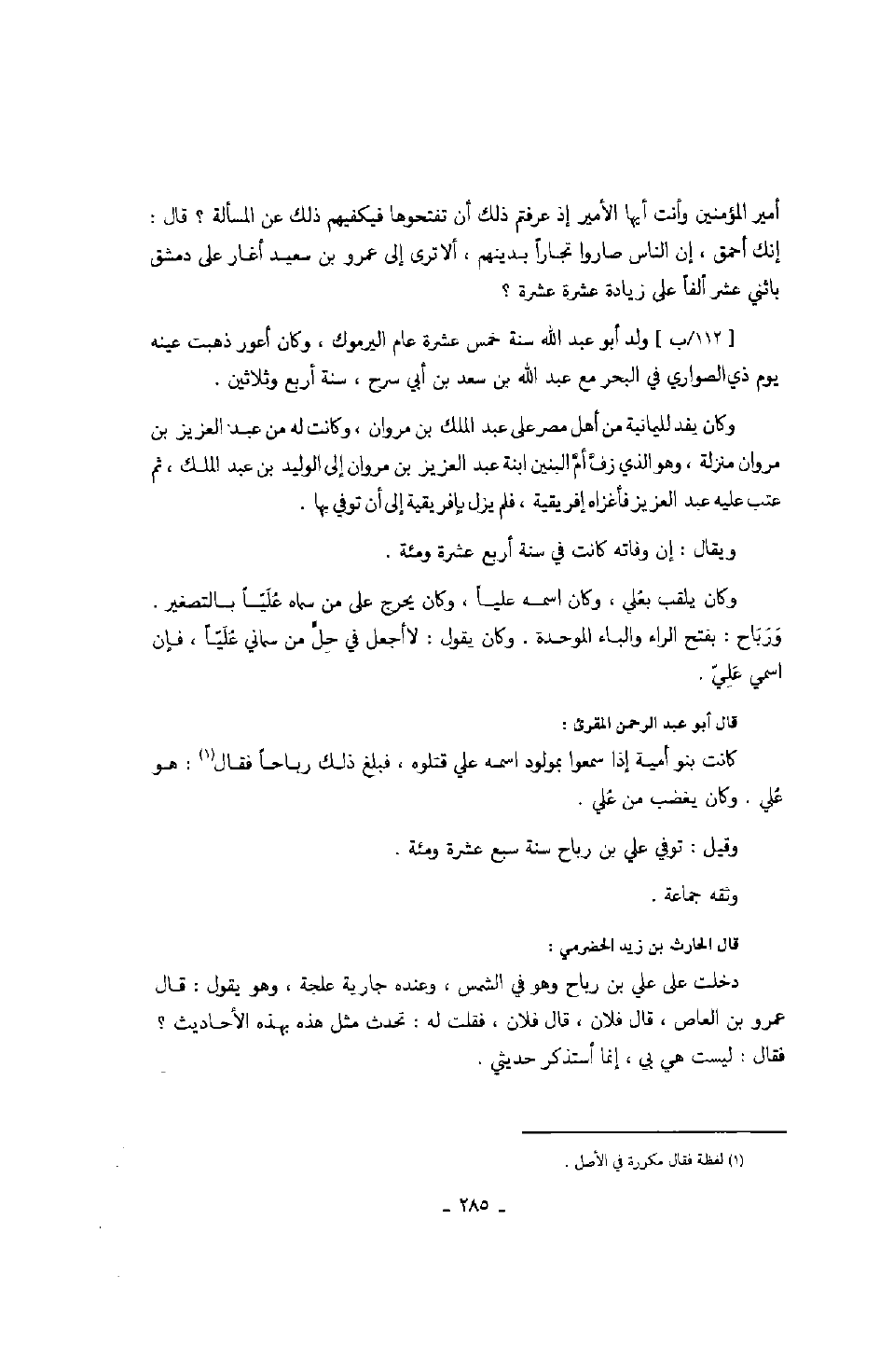 أمير المؤمنين وأنت أيها الأمير إذ عرفتم ذلك أن تفتحوها فيكفيهم ذلك عن المسألة؟ قال: إنك أحمق، إن الناس صاروا تجاراً بدينهم، ألا ترى إلى عمرو بن سعيد أغار على دمشق باثني عشر ألفاً على زيادة عشرة عشرة؟ ولد أبو عبد الله سنة خمس عشرة عام اليرموك، وكان أعور ذهبت عينه يوم الصواري في البحر مع عبد الله بن سعد بن أبي سرح، سنة أربع وثلاثين.