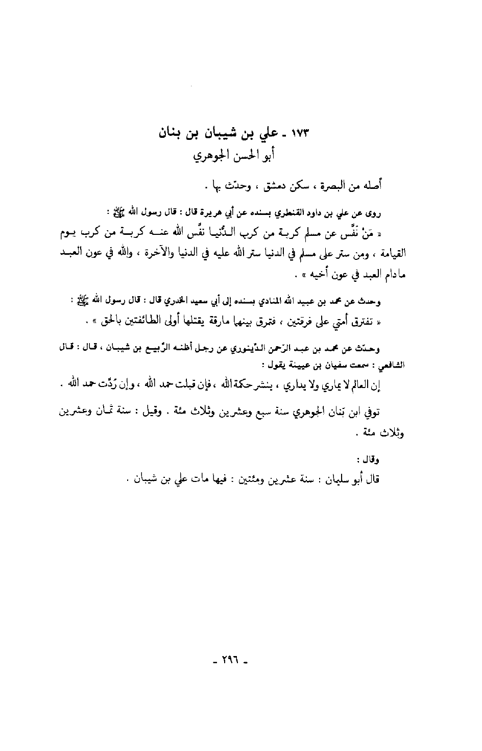 روى عن علي بن داود القنطري بسنده عن أبي هريرة قال: قال رسول الله صلّى الله عليه وسلّم: " من نفّس عن مسلم كربة من كرب الدّنيا نفّس الله عنه كربة من كرب يوم القيامة، ومن ستر على مسلم في الدنيا ستر الله عليه في الدنيا والآخرة، والله في عون العبد ما دام العبد في عون أخيه ".