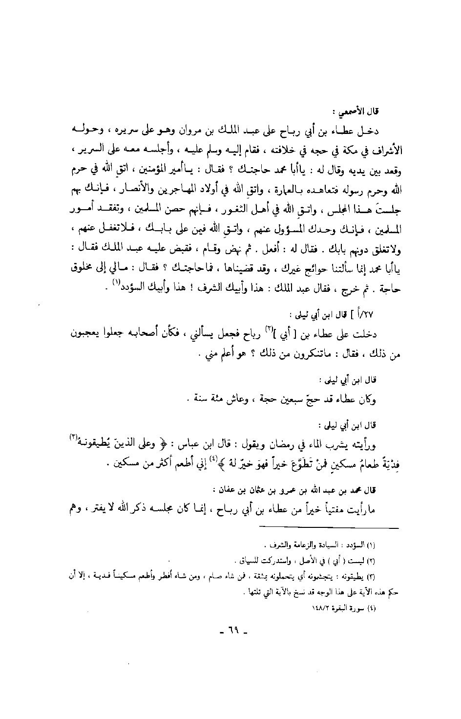 قال الأصمعي: دخل عطاء بن أبي رباح على عبد الملك بن مروان وهو على سريره، وحوله الأشراف في مكة في حجه في خلافته، فقام إليه وسلم عليه، وأجلسه معه على السرير، وقعد ين يديه وقال له: يا أبا محمد حاجتك؟ فقال: يا أمير المؤمنين، اتق الله في حرم الله وحرم رسوله فتعاهده بالعمارة، واتق الله في أولاد المهاجرين والأنصار، فإنك بهم جلست هذا المجلس، واتق الله في أهل الثغور، فإنهم حصن المسلمين، وتفقد أمور المسلمين، فإنك وحدك المسؤول عنهم، واتق الله فيمن على بابك، فلا تغفل عنهم، ولا تغلق دونهم بابك. فقال له: أفعل. ثم نهض وقام، فقبض عليه عبد الملك فقال: يا أبا محمد إنما سألتنا حوائج غيرك، وقد قضيناها، فما حاجتك؟ فقال: ما لي إلى مخلوق حاجة، ثم خرج، فقال عبد الملك: هذا وأبيك الشرف! هذا وأبيك السؤدد.