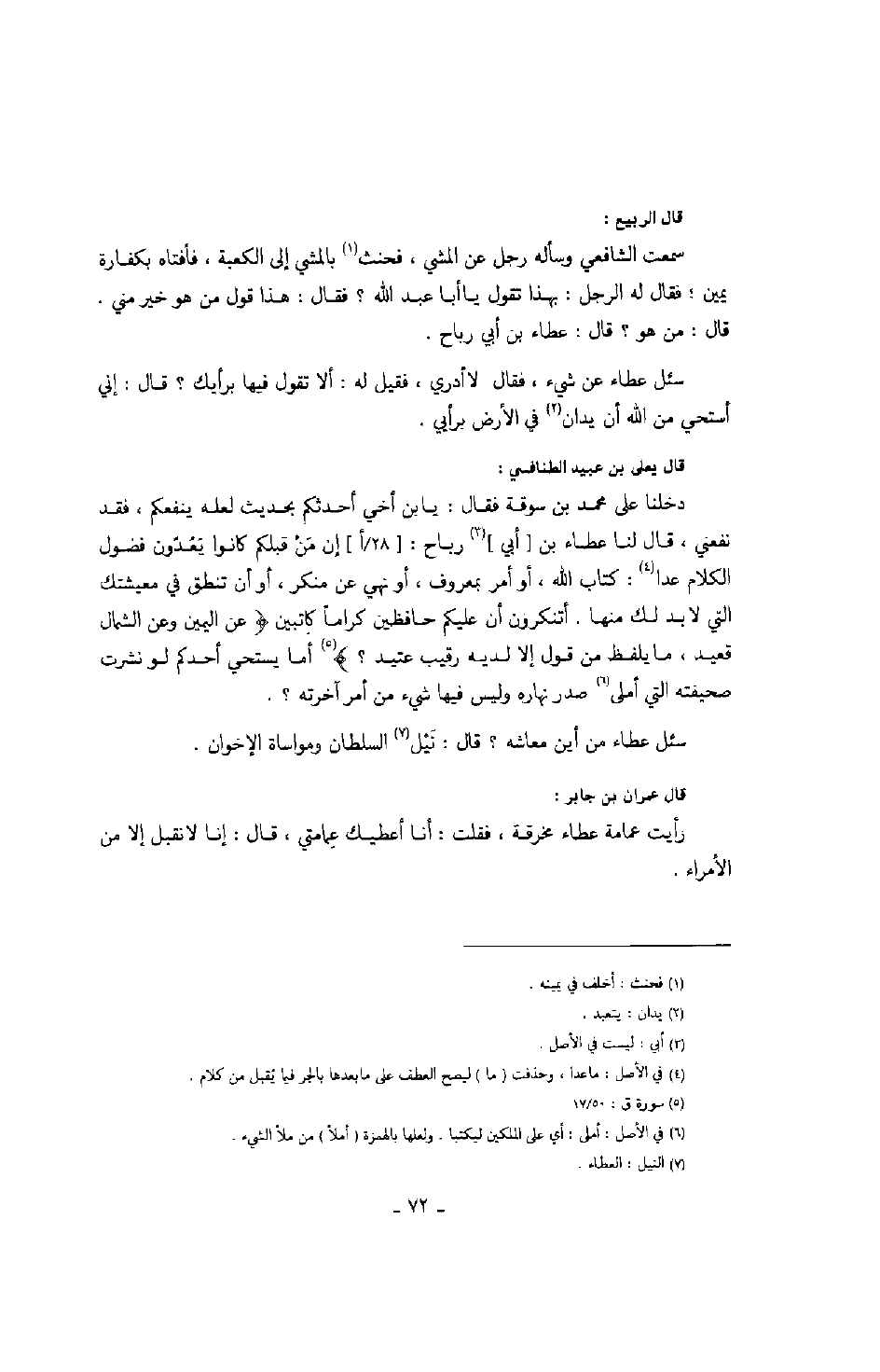 سمعت الشافعي وسأله رجل عن المشي، فحنث بالمشي إلى الكعبة، فأفتاه بكفارة يمين؛ فقال له الرجل: بهذا تقول يا أبا عبد الله؟ فقال: هذا قول من هو خير مني. قال: من هو؟ قال: عطاء بن أبي رباح.