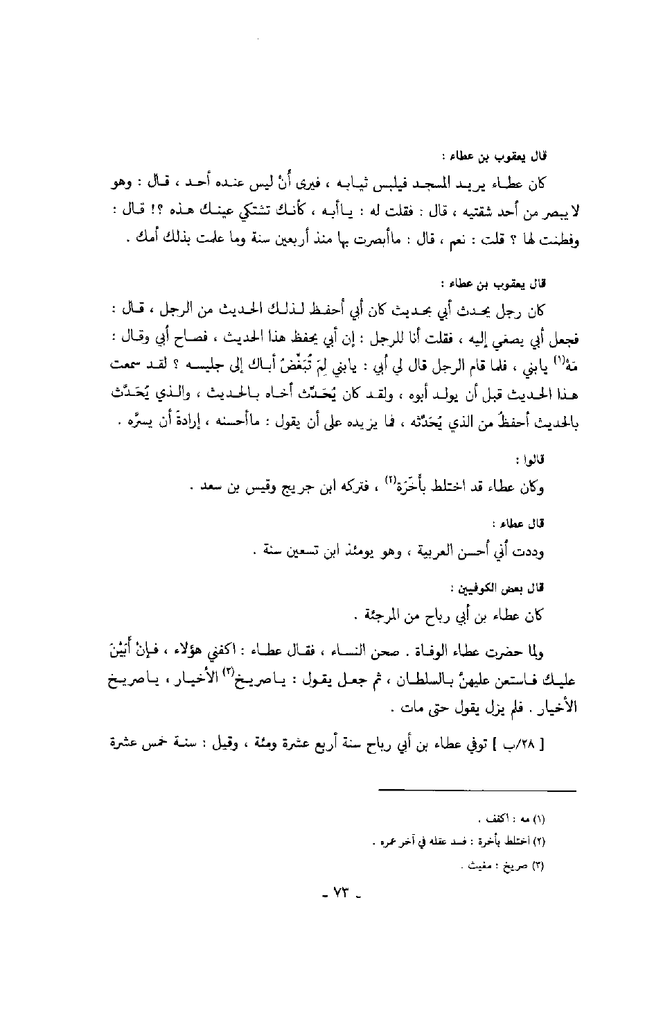 قال يعقوب بن عطاء: كان عطاء يريد المسجد فيلبس ثيابه، فيرى أن ليس عنده أحد، قال: وهو لا يبصر من أحد شقتيه، قال: فقلت له: يا أبه، كأنك تشتكي عينك هذه؟! قال: وفطنت لها؟ قلت: نعم، قال: ما أبصرت بها منذ أربعين سنة وما علمت أمك.